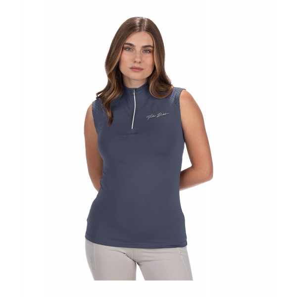 Спортивная футболка без рукавов, со стоячим воротником, застежкой-молнией и защитой подбородка. Оптимальная вентиляция благодаря функциональной перфорации в области плеч и верхней части спины. Дышащая и быстросохнущая. С логотипом. 88% полиэстер, 12% эластан.