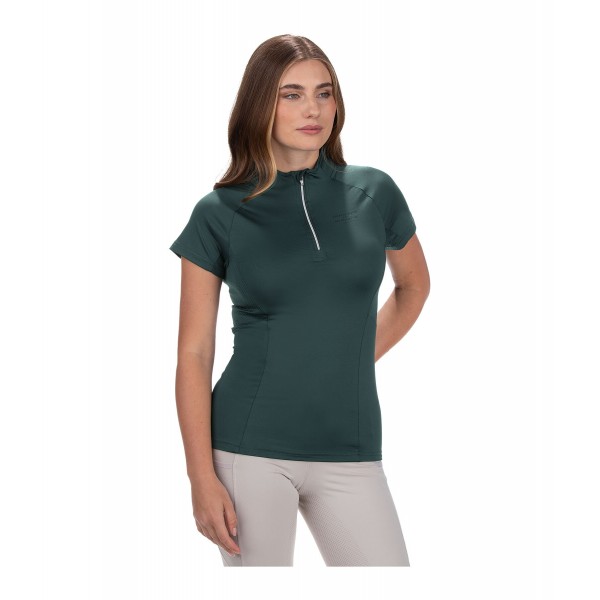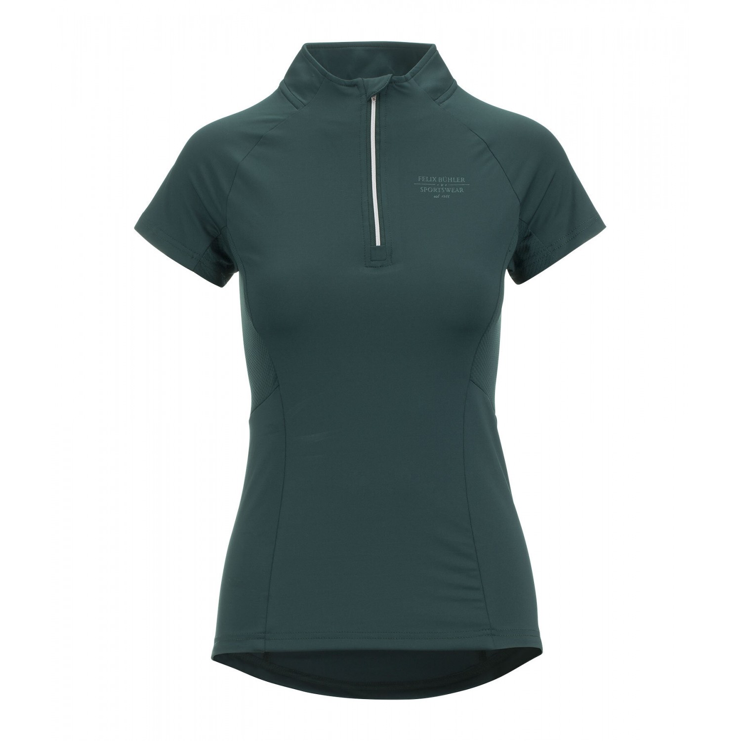 Эластичная и мягкая футболка на молнии с люрексом и воротником-стойкой. Отличная воздухопроницаемость благодаря боковым сетчатым вставкам. Быстросохнущая. 88% полиэстер, 12% эластан.