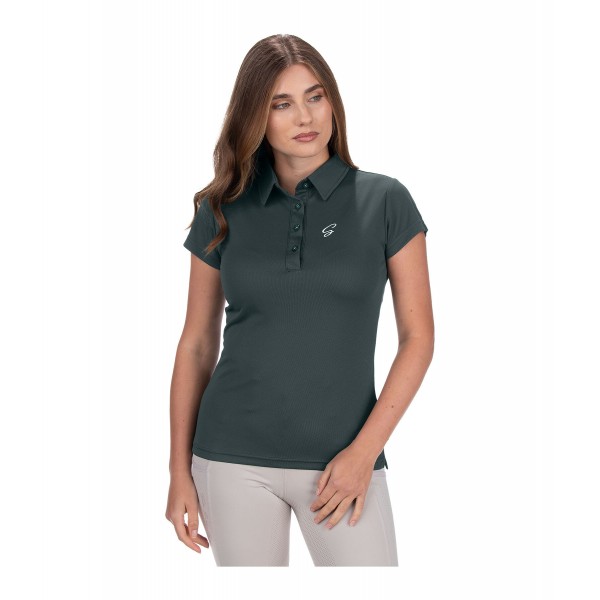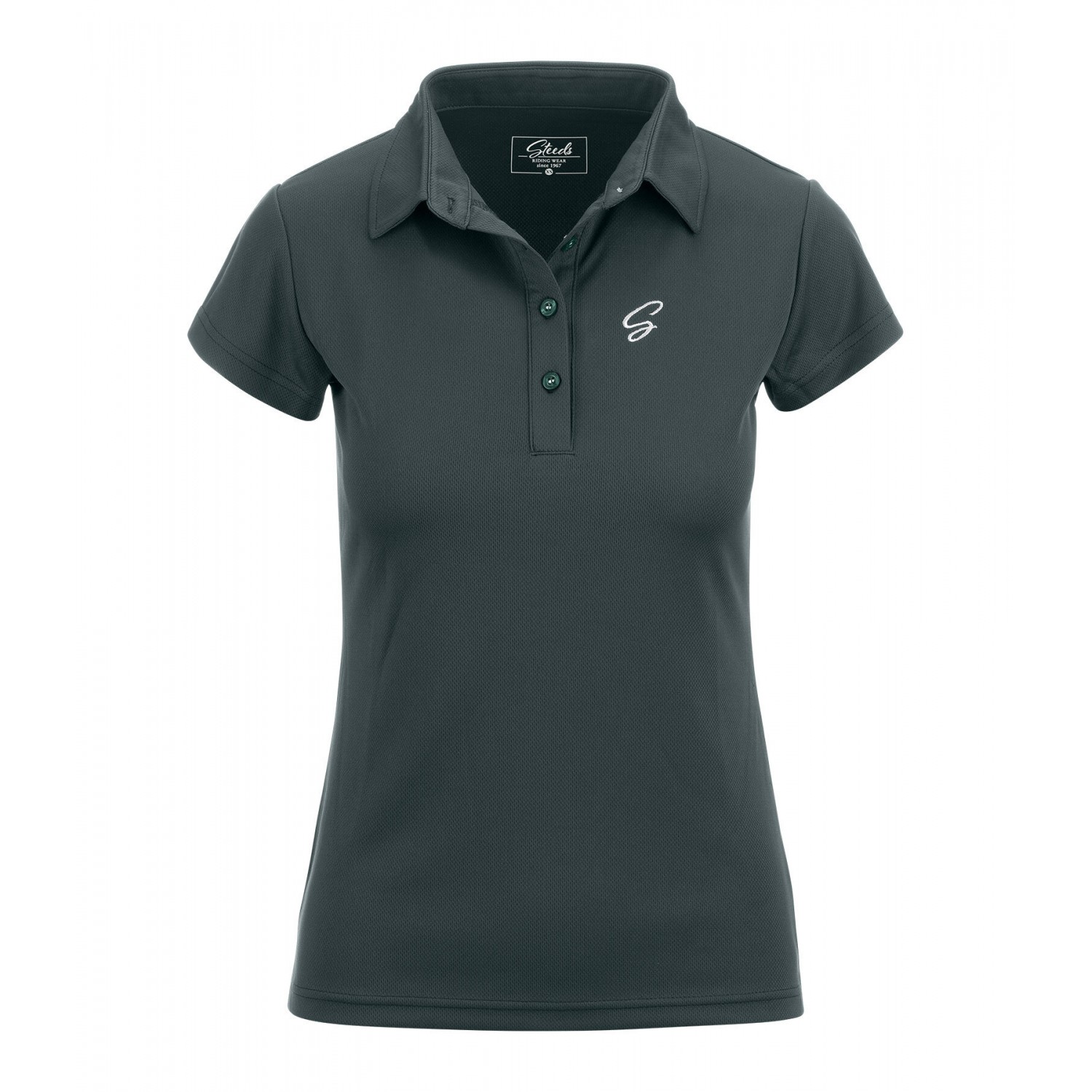 Спортивная эластичная футболка-поло с планкой на пуговицах из дышащего, быстросохнущего функционального материала. Вышитый логотип STEEDS на груди. 100% полиэстер.
