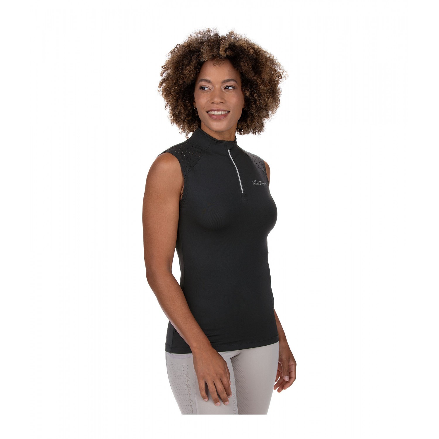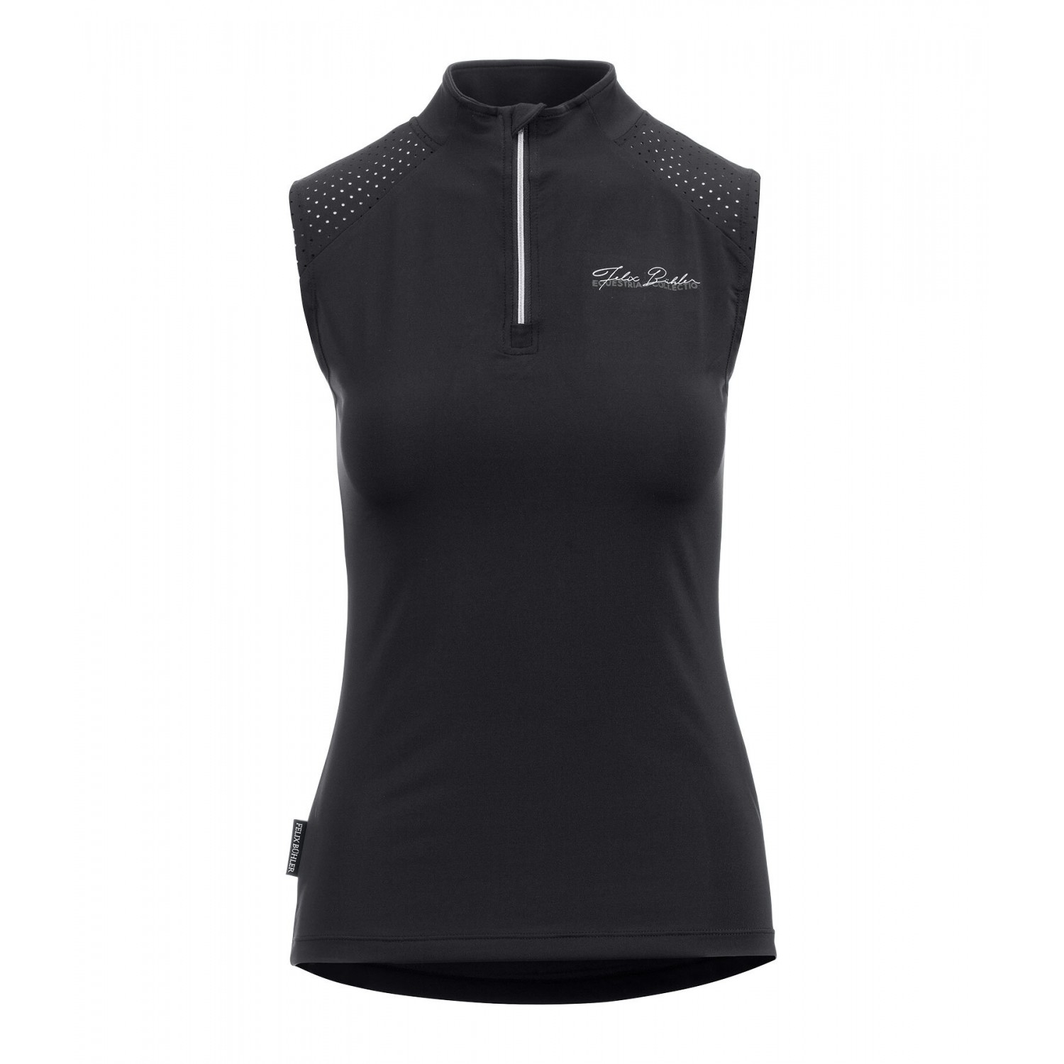 Спортивная футболка без рукавов, со стоячим воротником, застежкой-молнией и защитой подбородка. Оптимальная вентиляция благодаря функциональной перфорации в области плеч и верхней части спины. Дышащая и быстросохнущая. С логотипом. 88% полиэстер, 12% эластан.