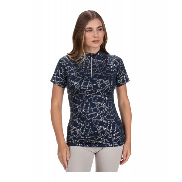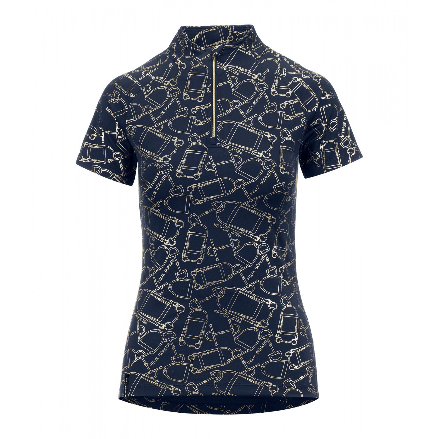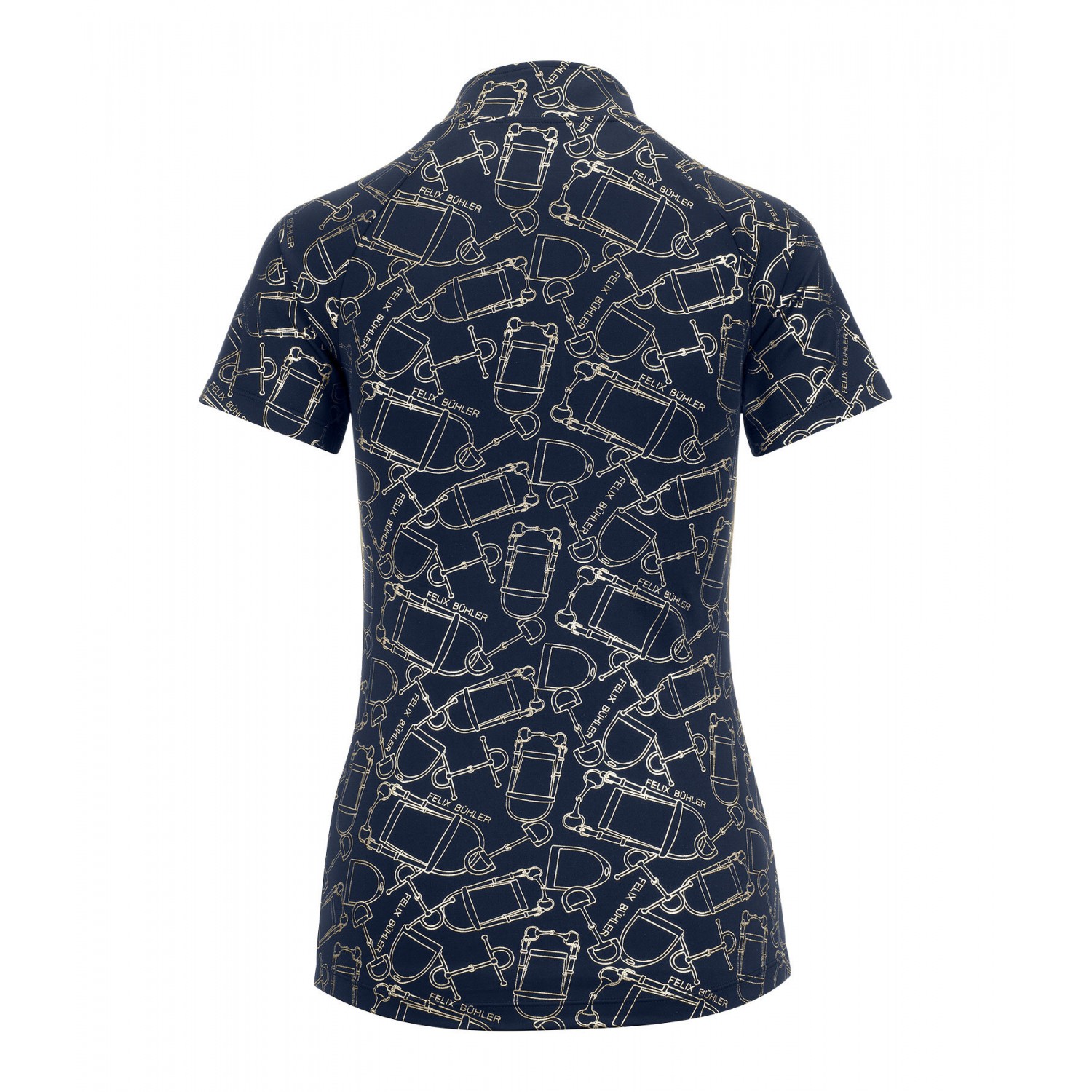 Стильная спортивная футболка с металлизированным принтом по всей поверхности. Имеет рукава реглан, воротник-стойку на молнии и защиту подбородка. Дышащая и быстросохнущая. 88% полиэстер, 12% эластан.