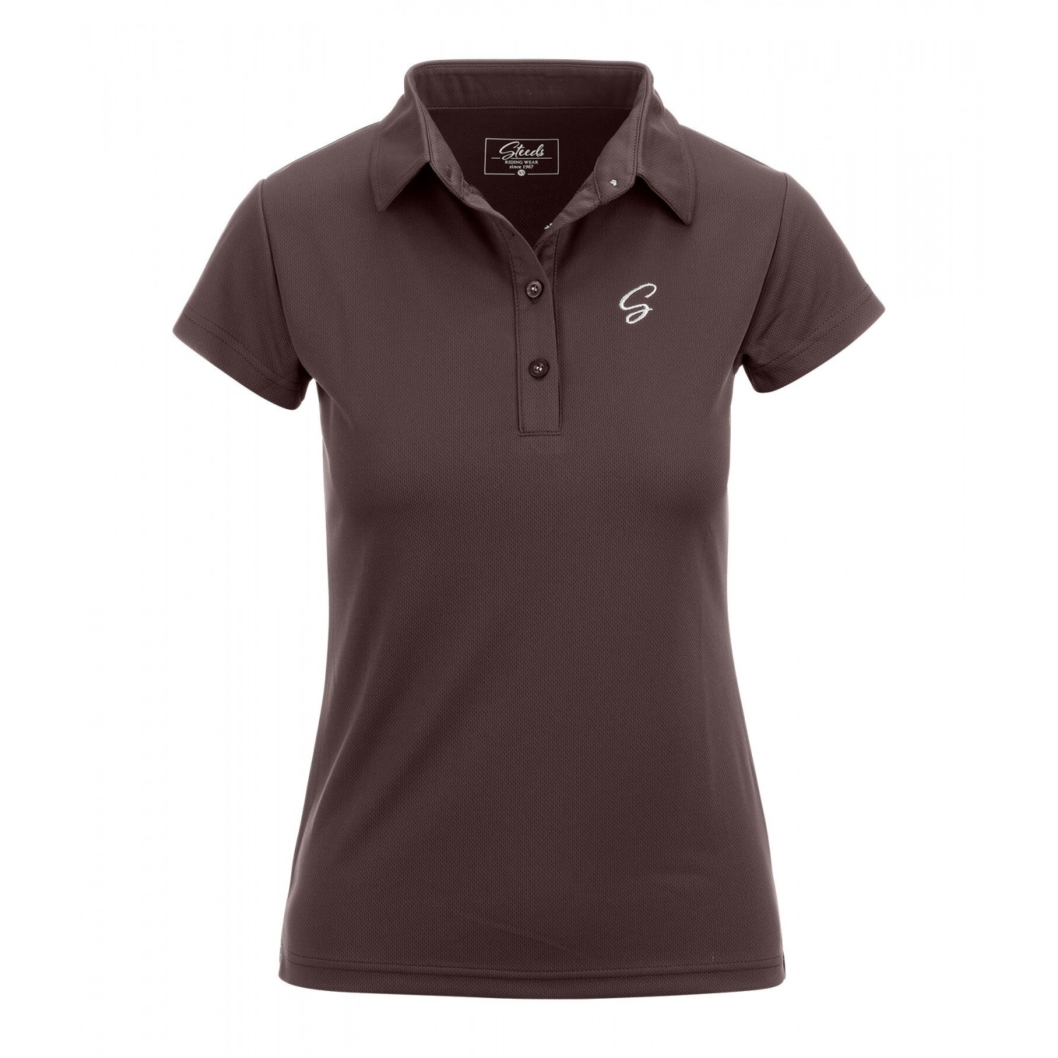 Спортивная эластичная футболка-поло с планкой на пуговицах из дышащего, быстросохнущего функционального материала. Вышитый логотип STEEDS на груди. 100% полиэстер.