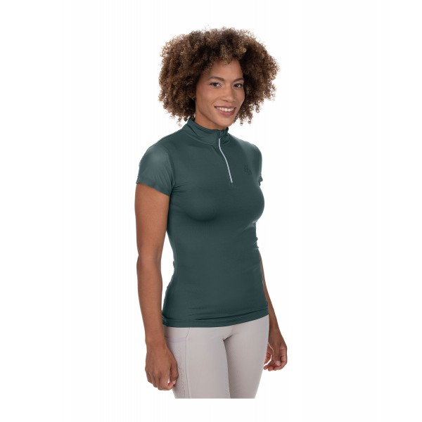 Дышащая и быстросохнущая футболка с короткими сетчатыми рукавами, воротником-стойкой на молнии и защитой подбородка. Вышивка логотипа на груди. 88% полиэстер, 12% эластан, сетчатая ткань 100% полиэстер.