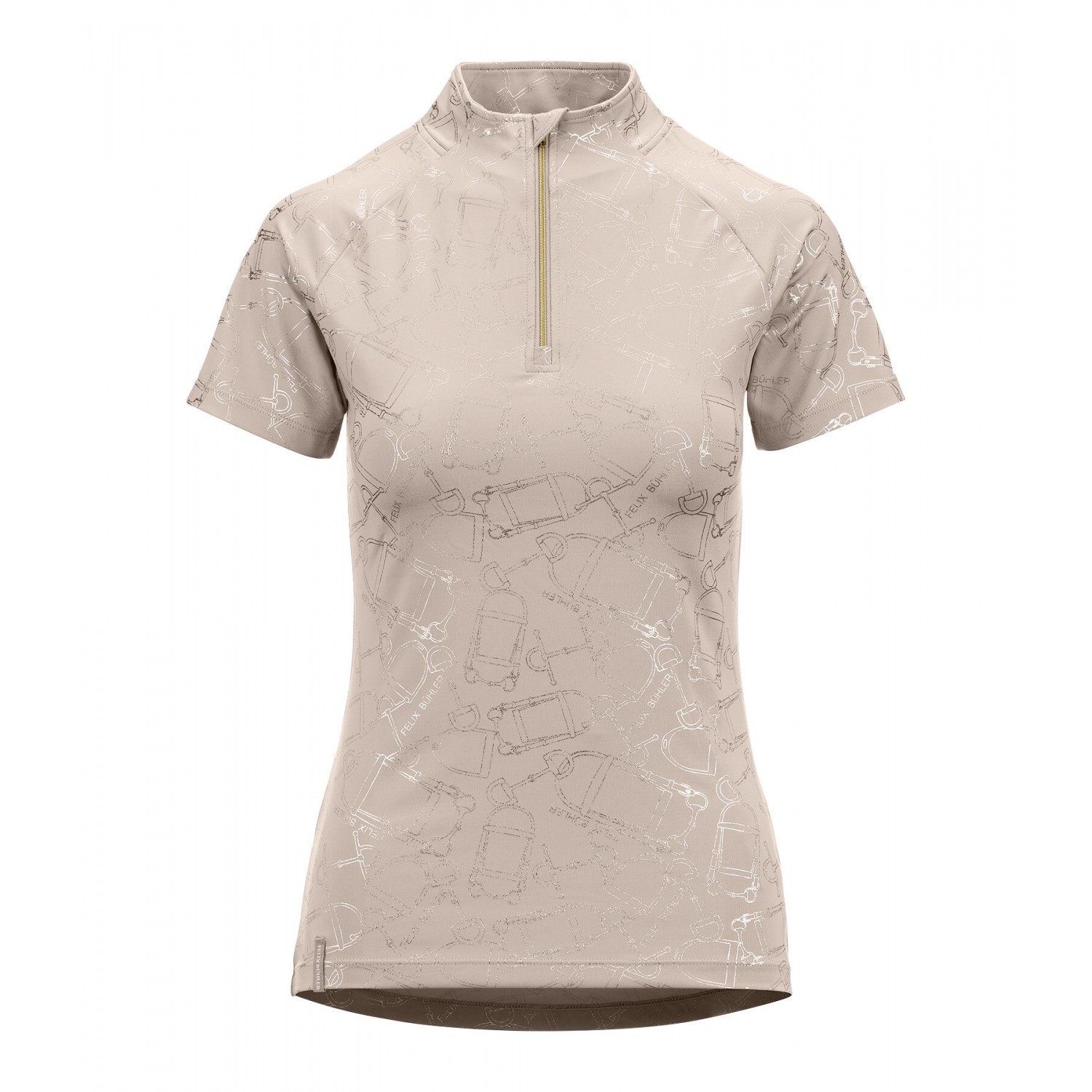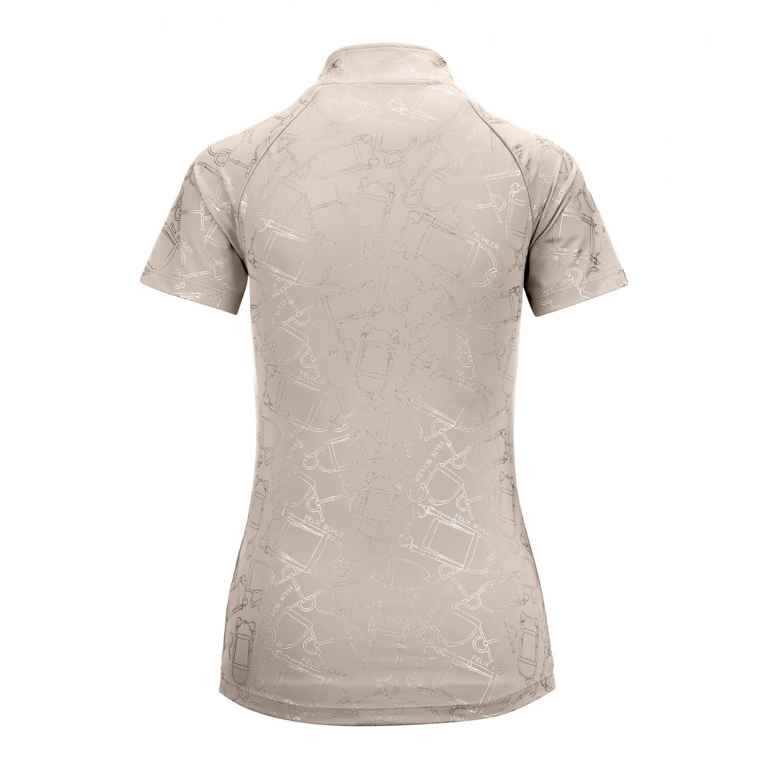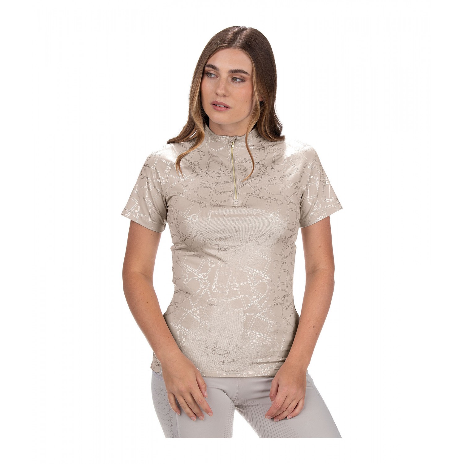 Стильная спортивная футболка с металлизированным принтом по всей поверхности. Имеет рукава реглан, воротник-стойку на молнии и защиту подбородка. Дышащая и быстросохнущая. 88% полиэстер, 12% эластан.
