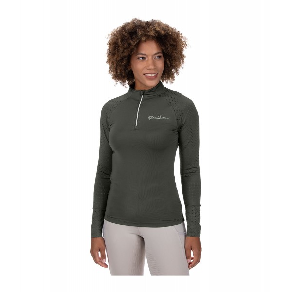 Эта спортивная, дышащая и быстросохнущая футболка с длинными рукавами обеспечивает оптимальную вентиляцию благодаря лазерной перфорации на рукавах реглан и верхней части спины. Она украшена логотипом, имеет воротник-стойку с молнией и защитой подбородка. Состав: 88% полиэстер, 12% эластан.