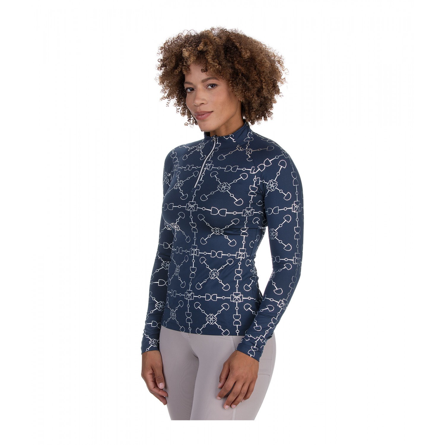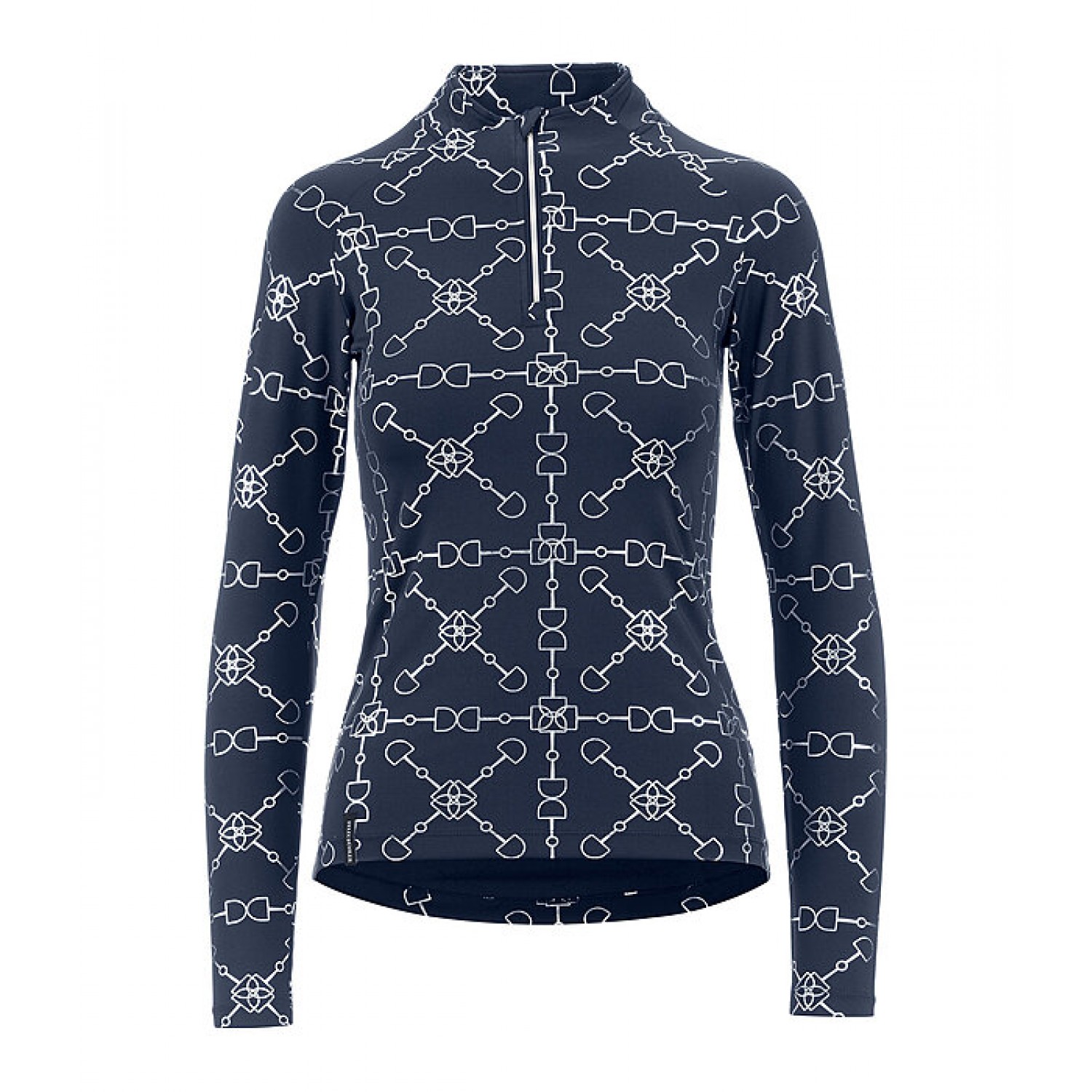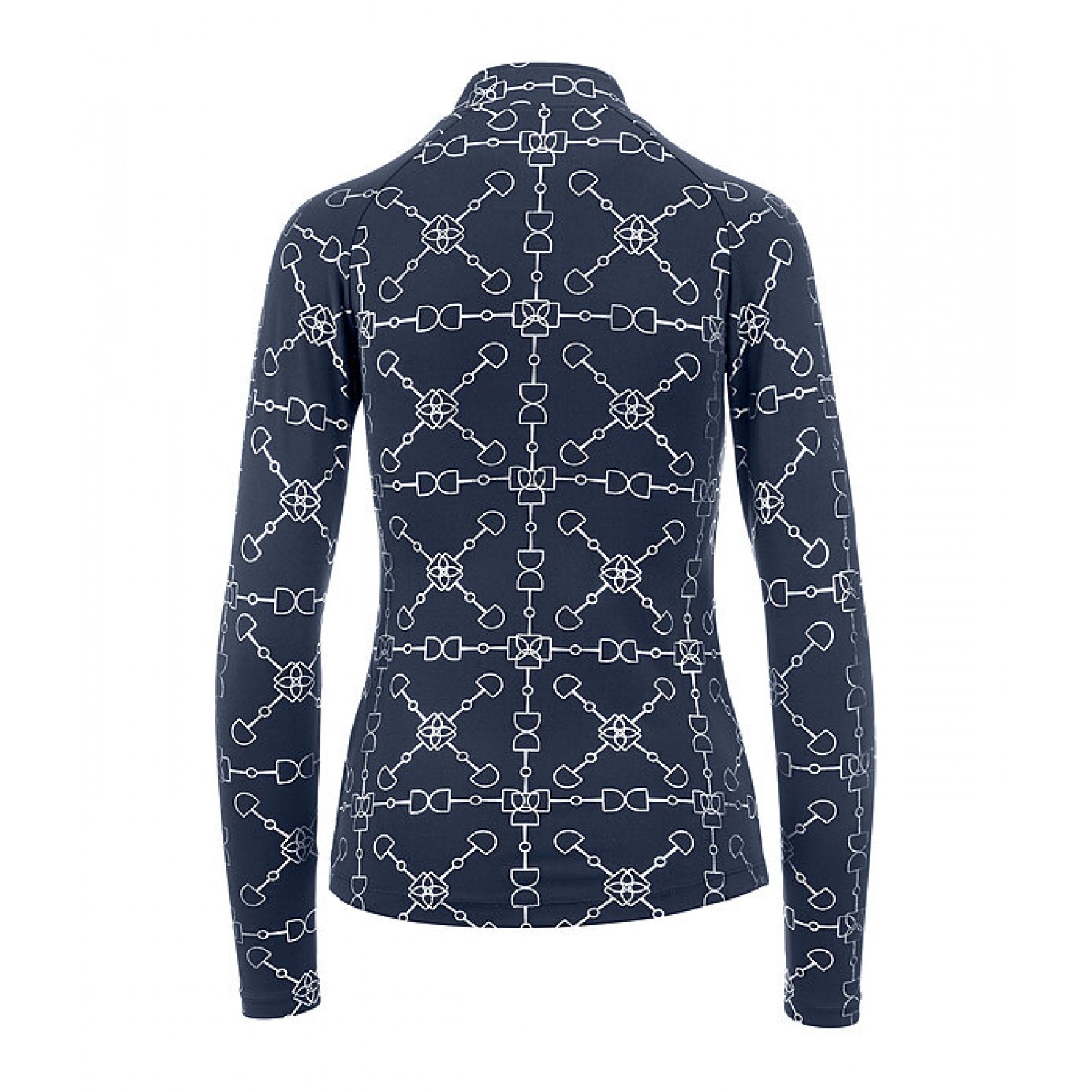 Стильная спортивная рубашка с элегантным глянцевым принтом по всей поверхности. Дышащая и быстросохнущая. Рукава реглан и воротник-стойка на молнии с защитой подбородка. Состав: 88% полиэстер, 12% эластан.