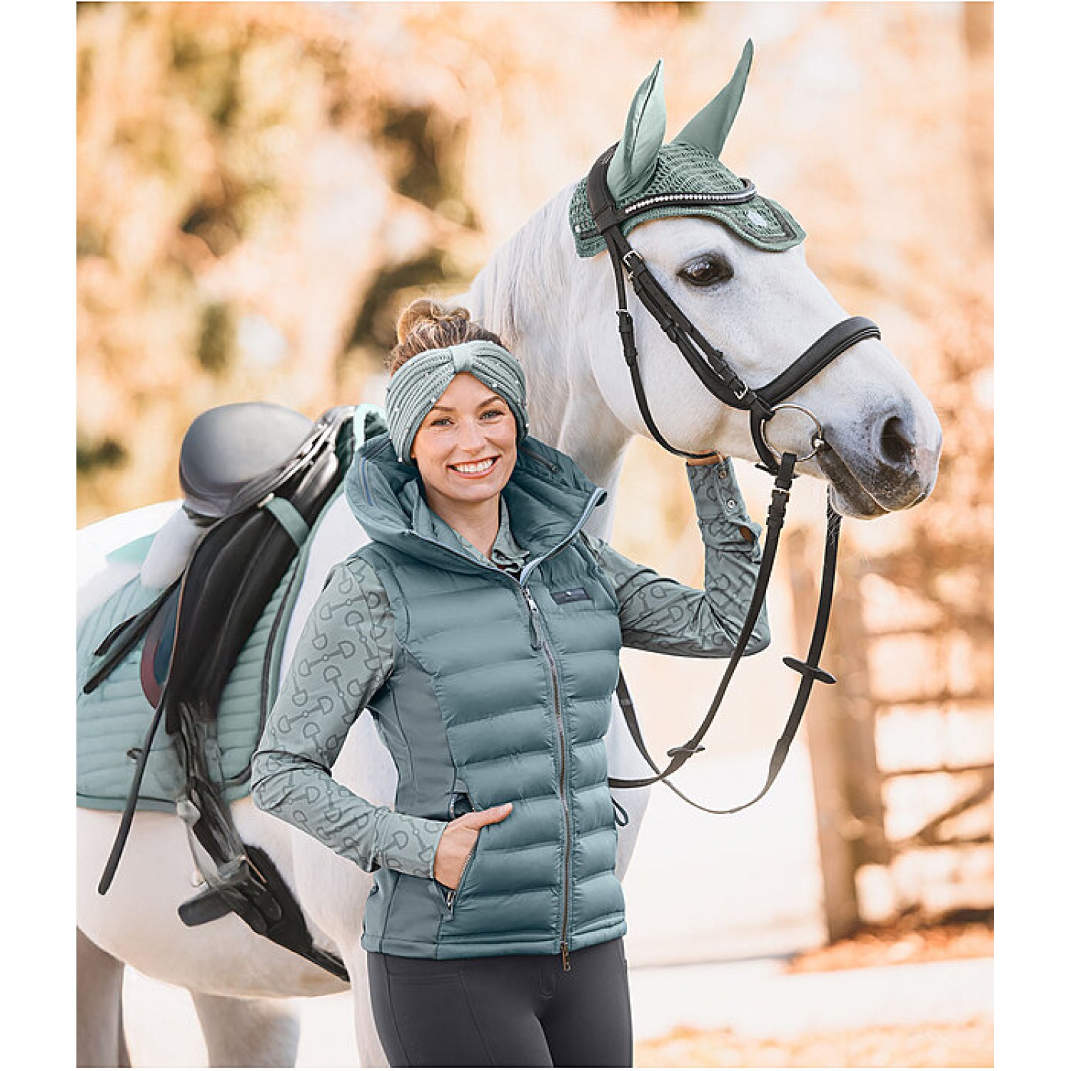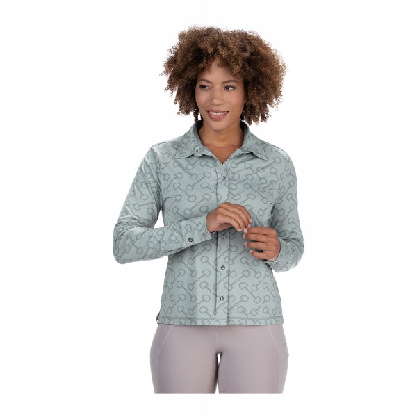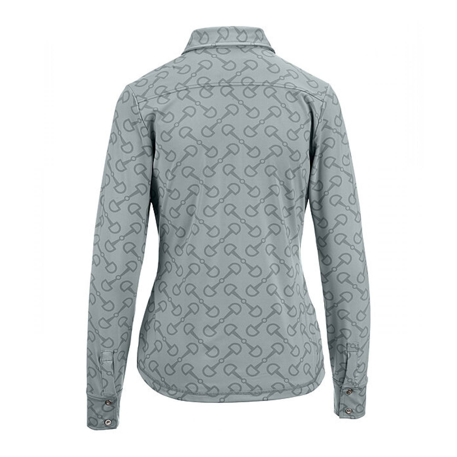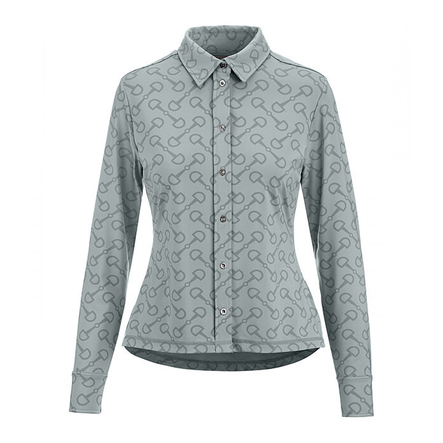 Элегантная эластичная блузка из дышащей и быстросохнущей ткани с принтом по всей поверхности. Планка и пуговицы на манжетах. Состав: 85% полиэстер, 15% эластан.