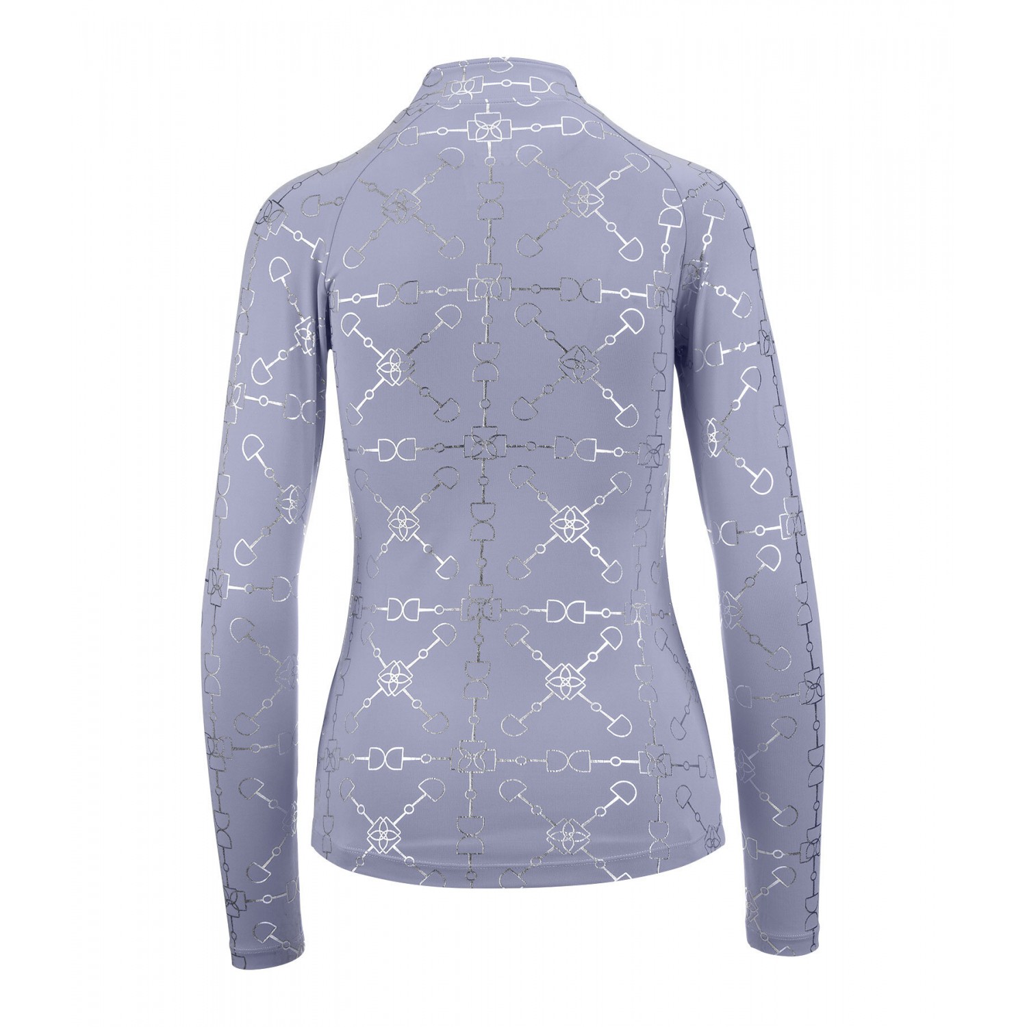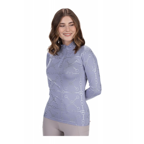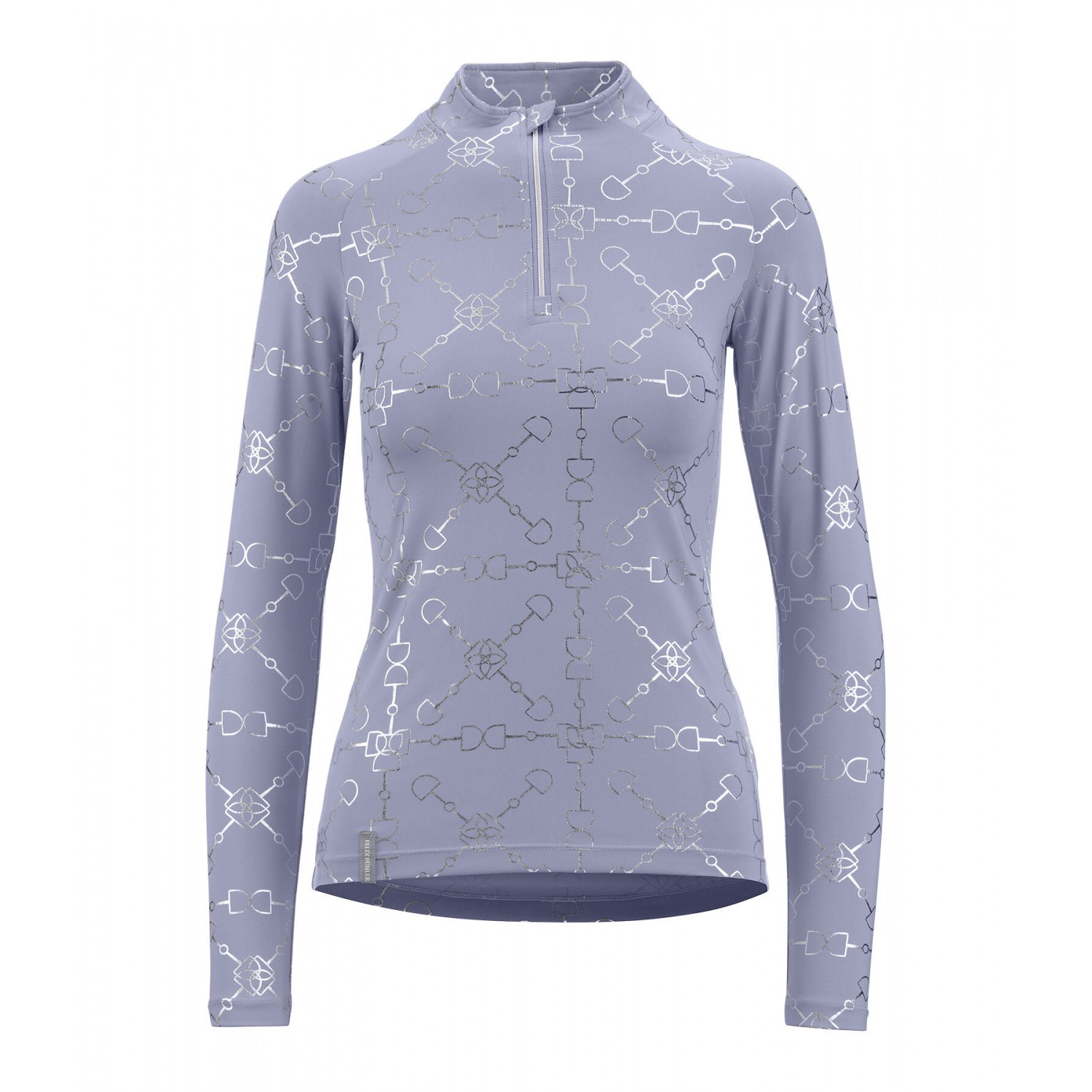 Стильная спортивная рубашка с элегантным глянцевым принтом по всей поверхности. Дышащая и быстросохнущая. Рукава реглан и воротник-стойка на молнии с защитой подбородка. Состав: 88% полиэстер, 12% эластан.