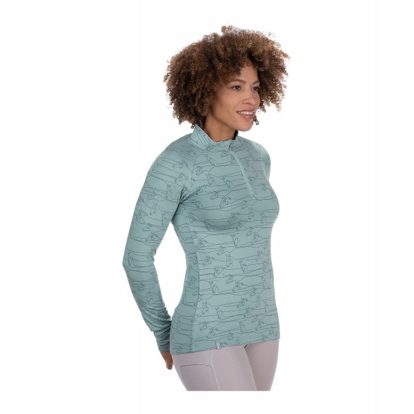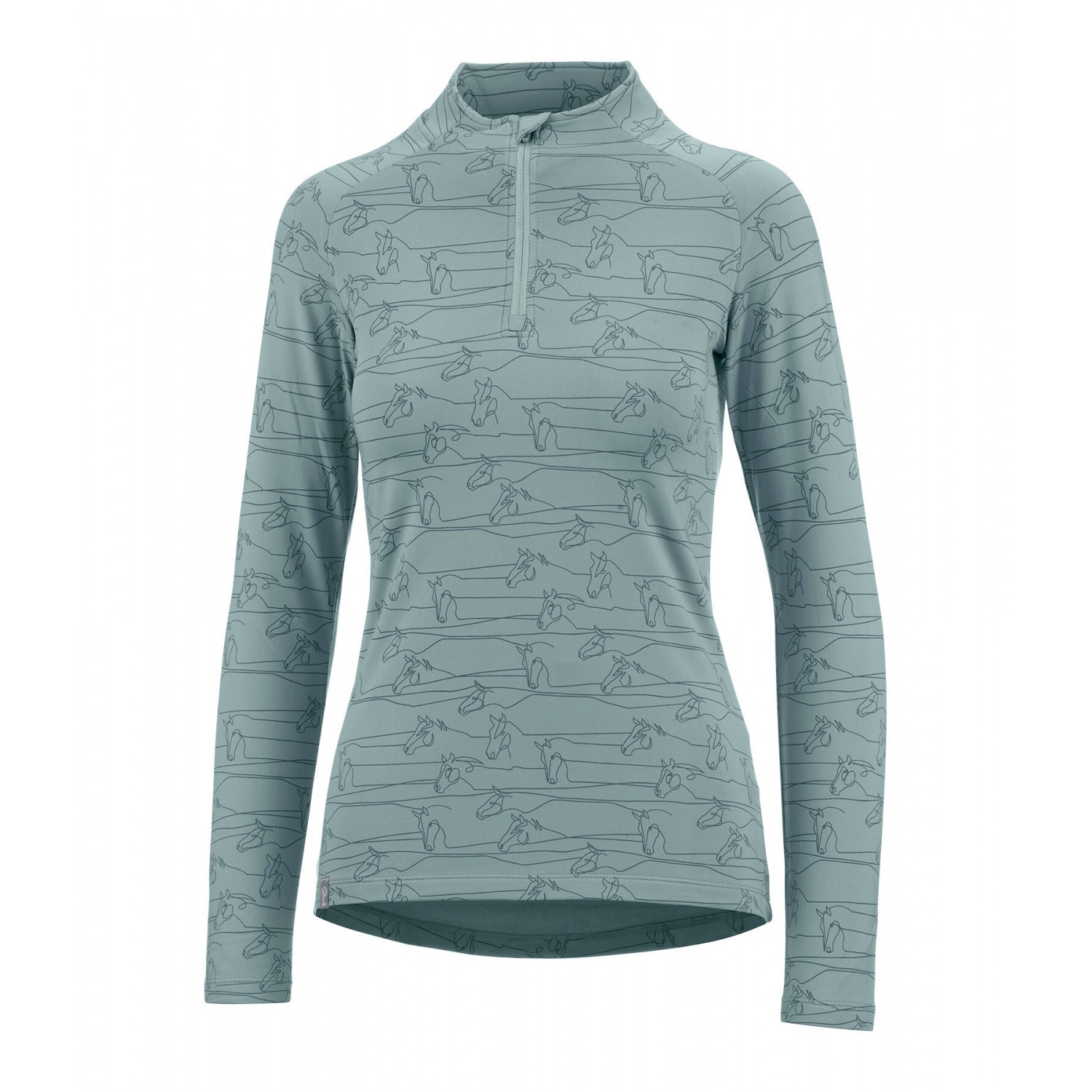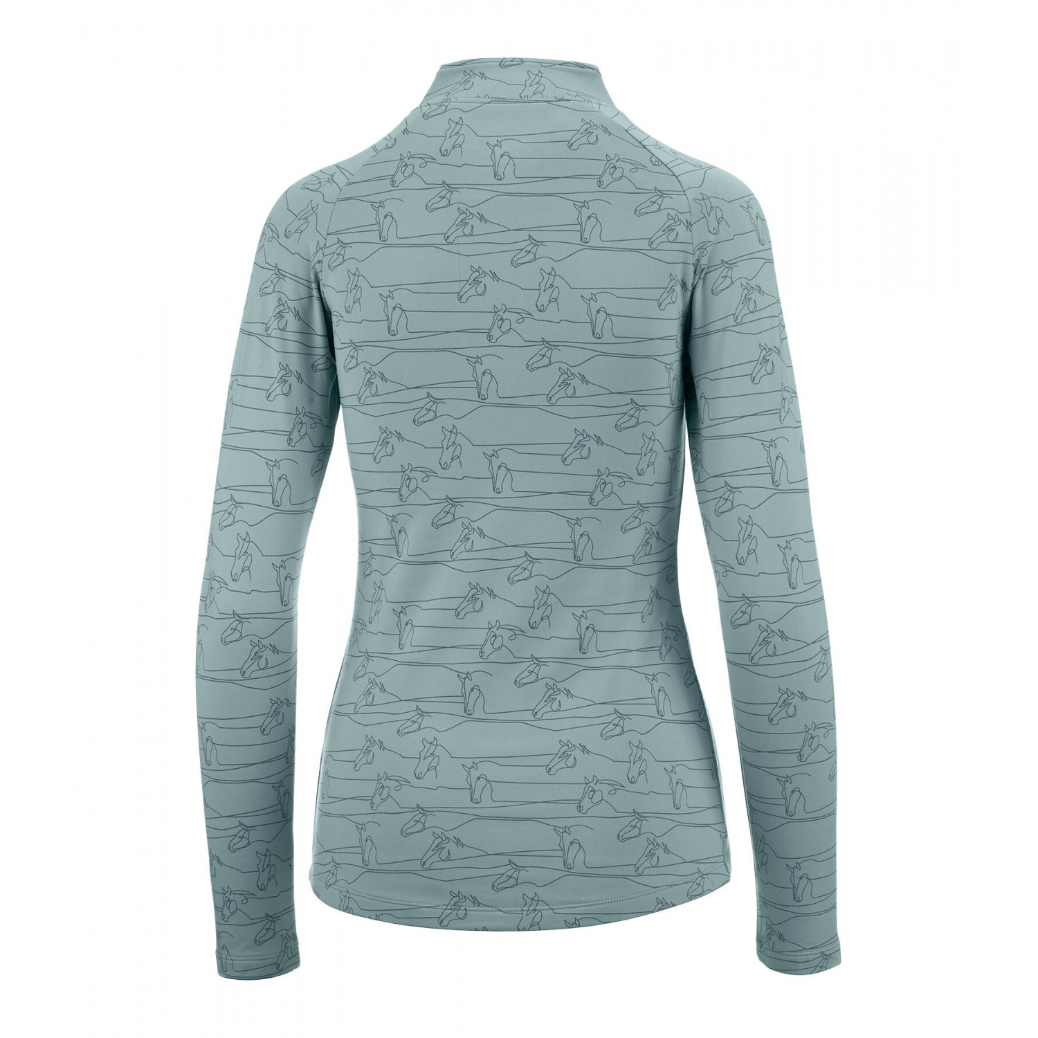 Модный гольф с длинными рукавами, начесом и красивым принтом лошадей в тон по всей поверхности. Рукава реглан, воротник-стойка на молнии с защитой подбородка. Дышащая и быстросохнущая ткань. Состав: 90% полиэстер, 10% эластан.