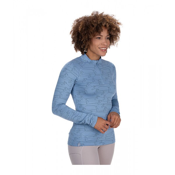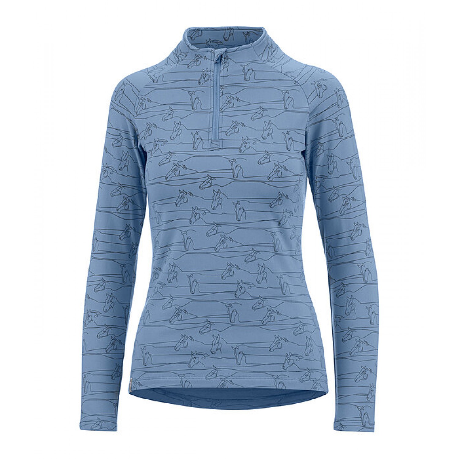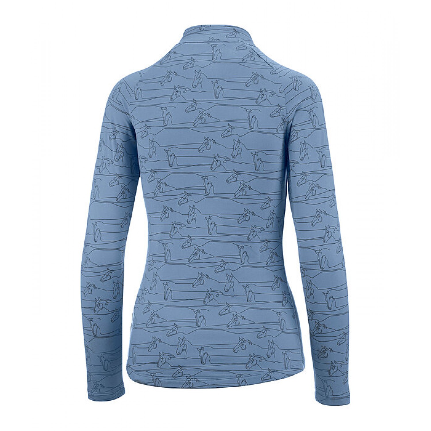 Модный гольф с длинными рукавами, начесом и красивым принтом лошадей в тон по всей поверхности. Рукава реглан, воротник-стойка на молнии с защитой подбородка. Дышащая и быстросохнущая ткань. Состав: 90% полиэстер, 10% эластан.