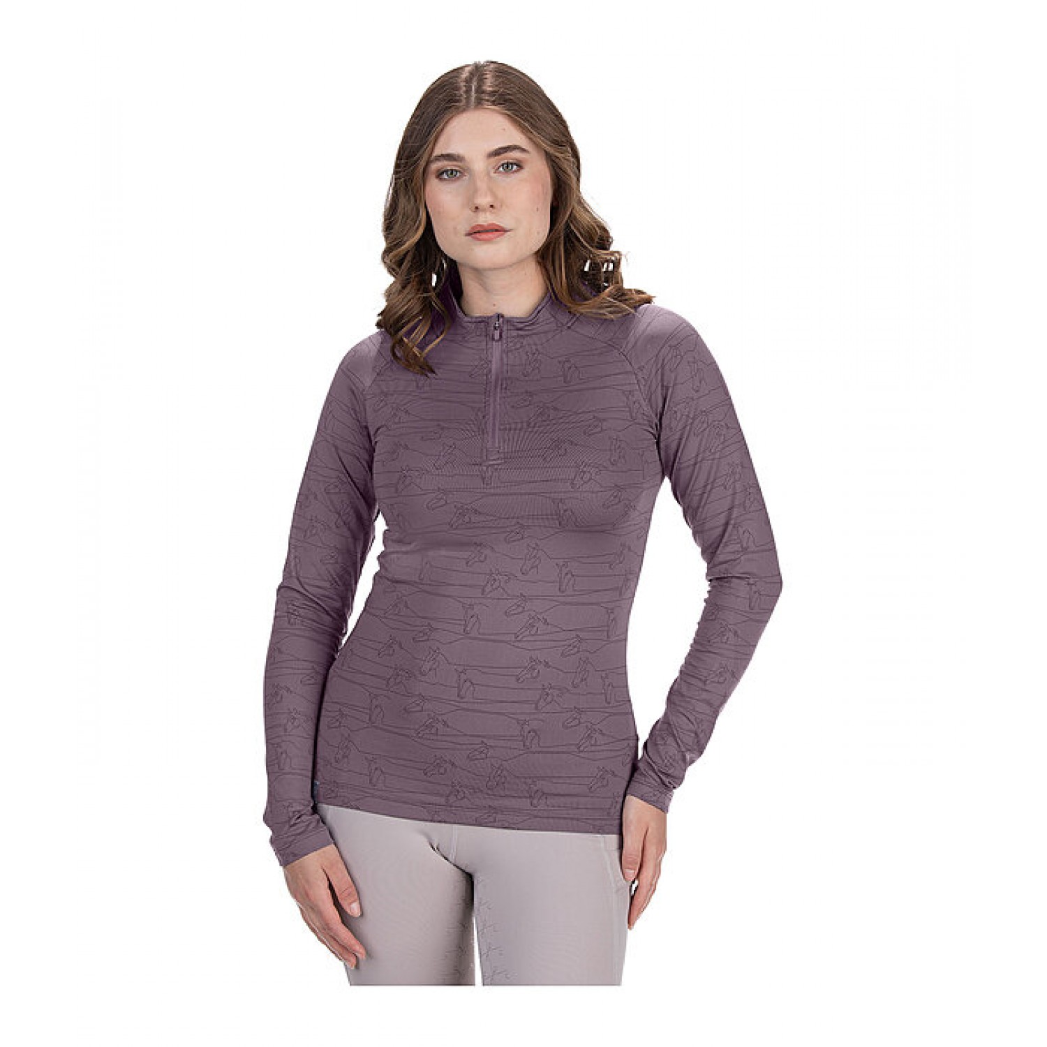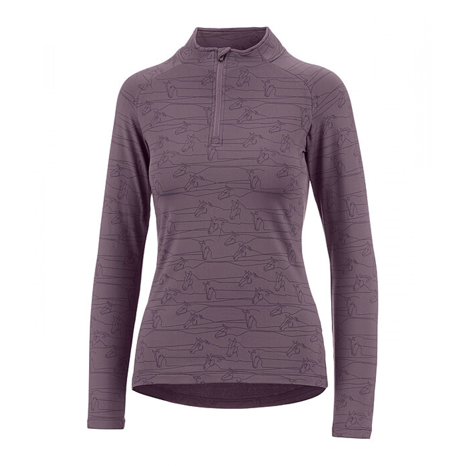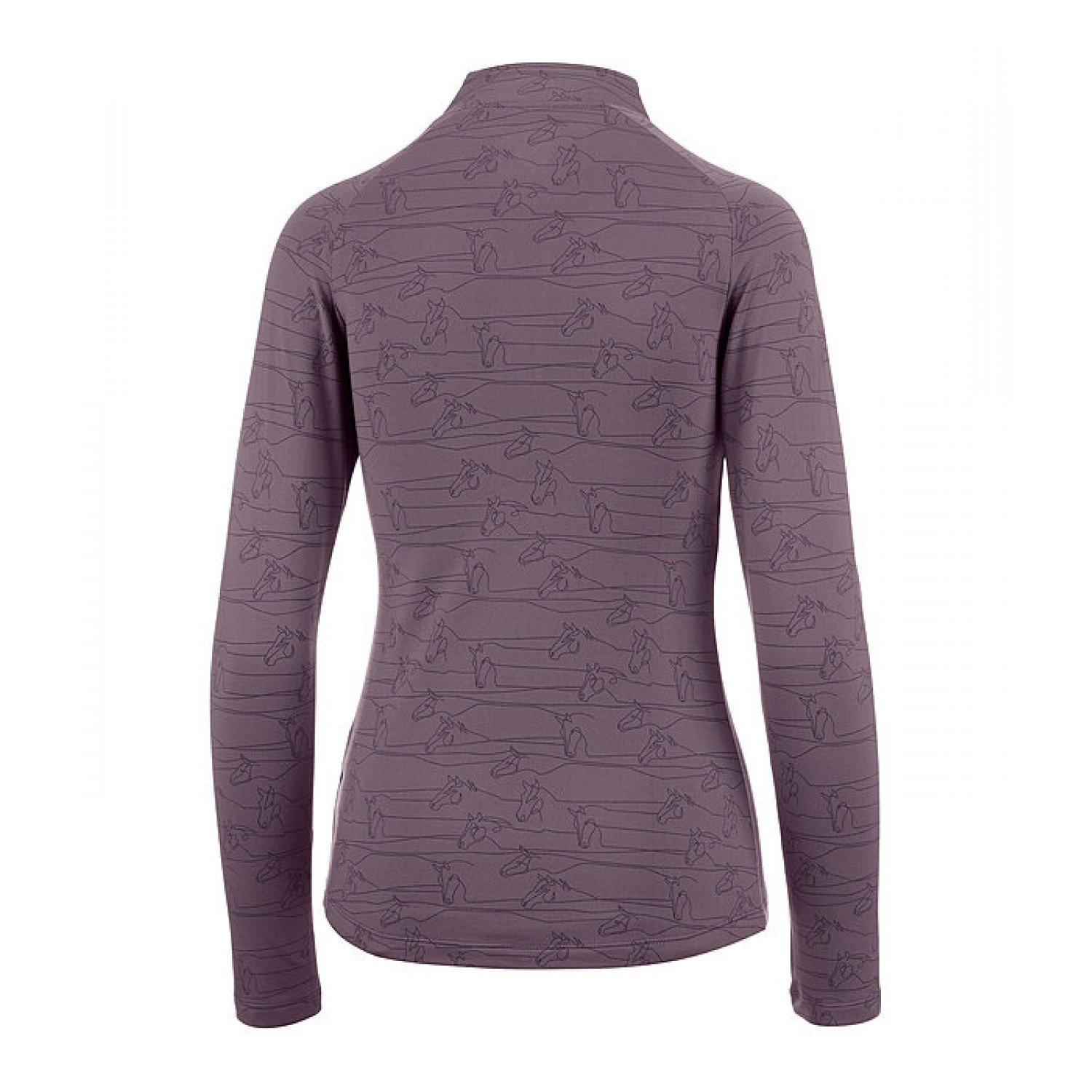 Модный гольф с длинными рукавами, начесом и красивым принтом лошадей в тон по всей поверхности. Рукава реглан, воротник-стойка на молнии с защитой подбородка. Дышащая и быстросохнущая ткань. Состав: 90% полиэстер, 10% эластан.