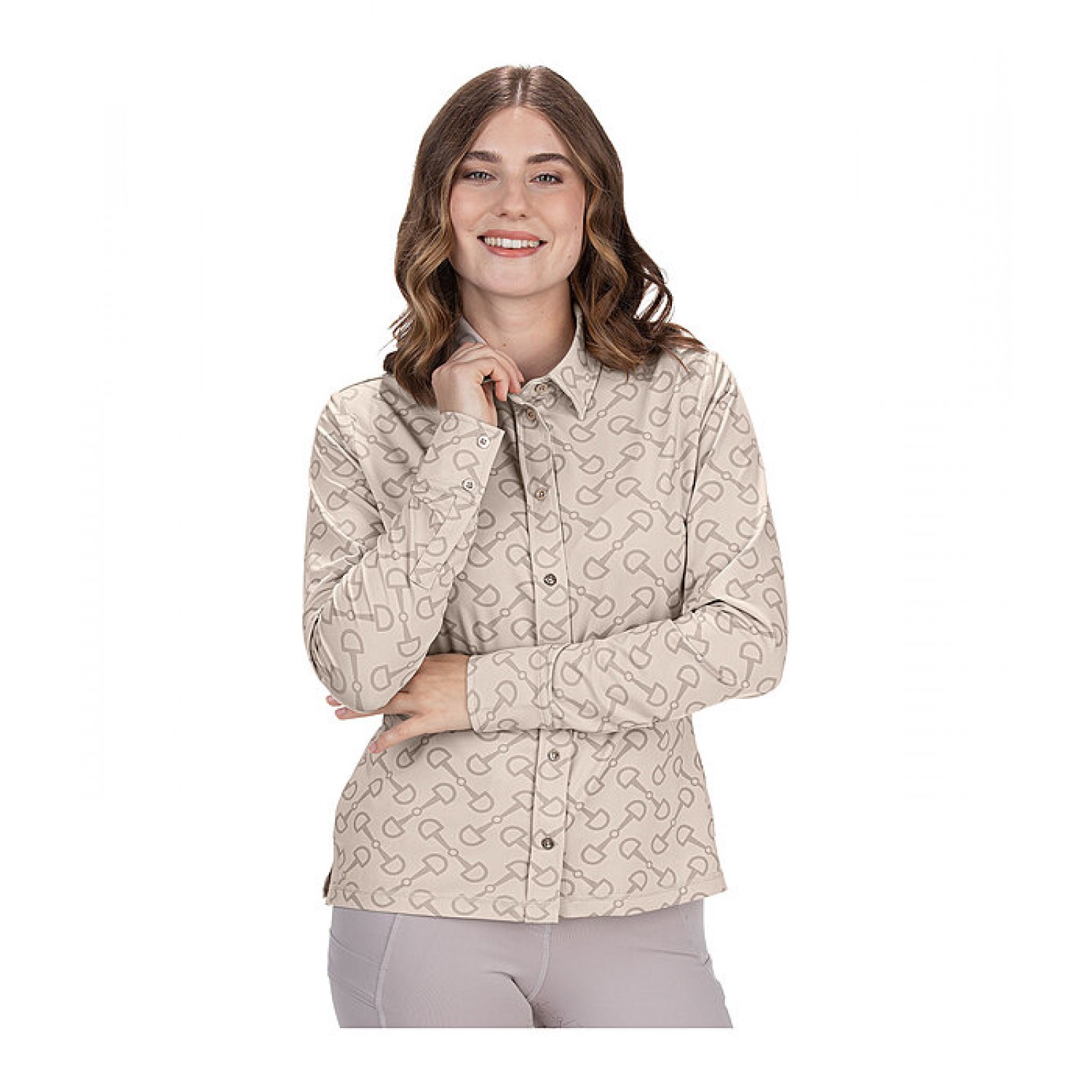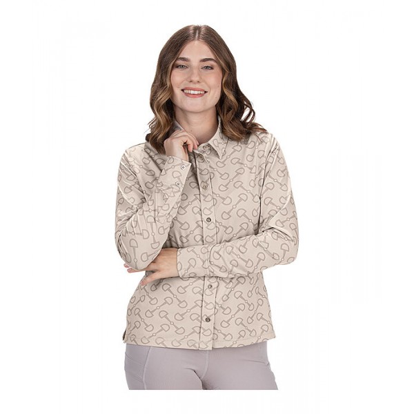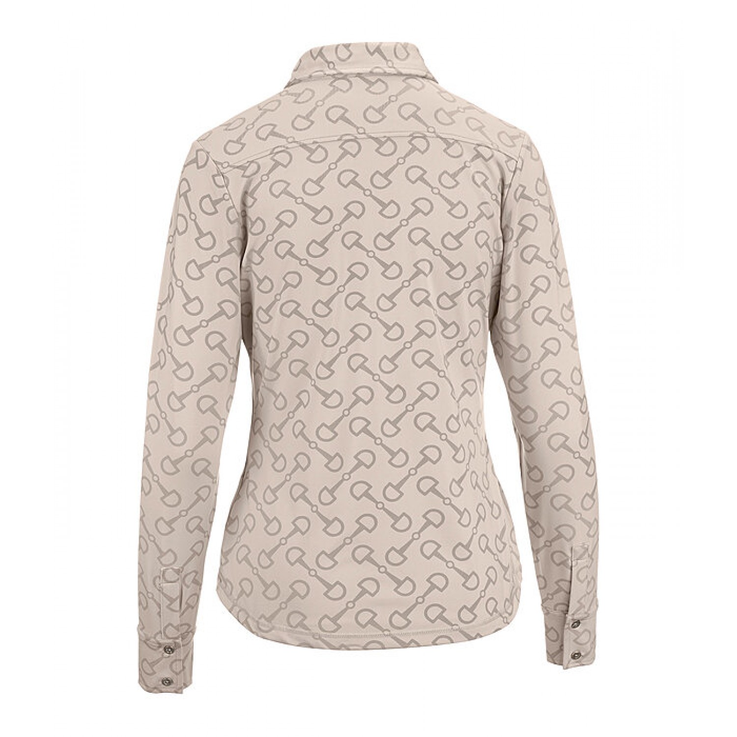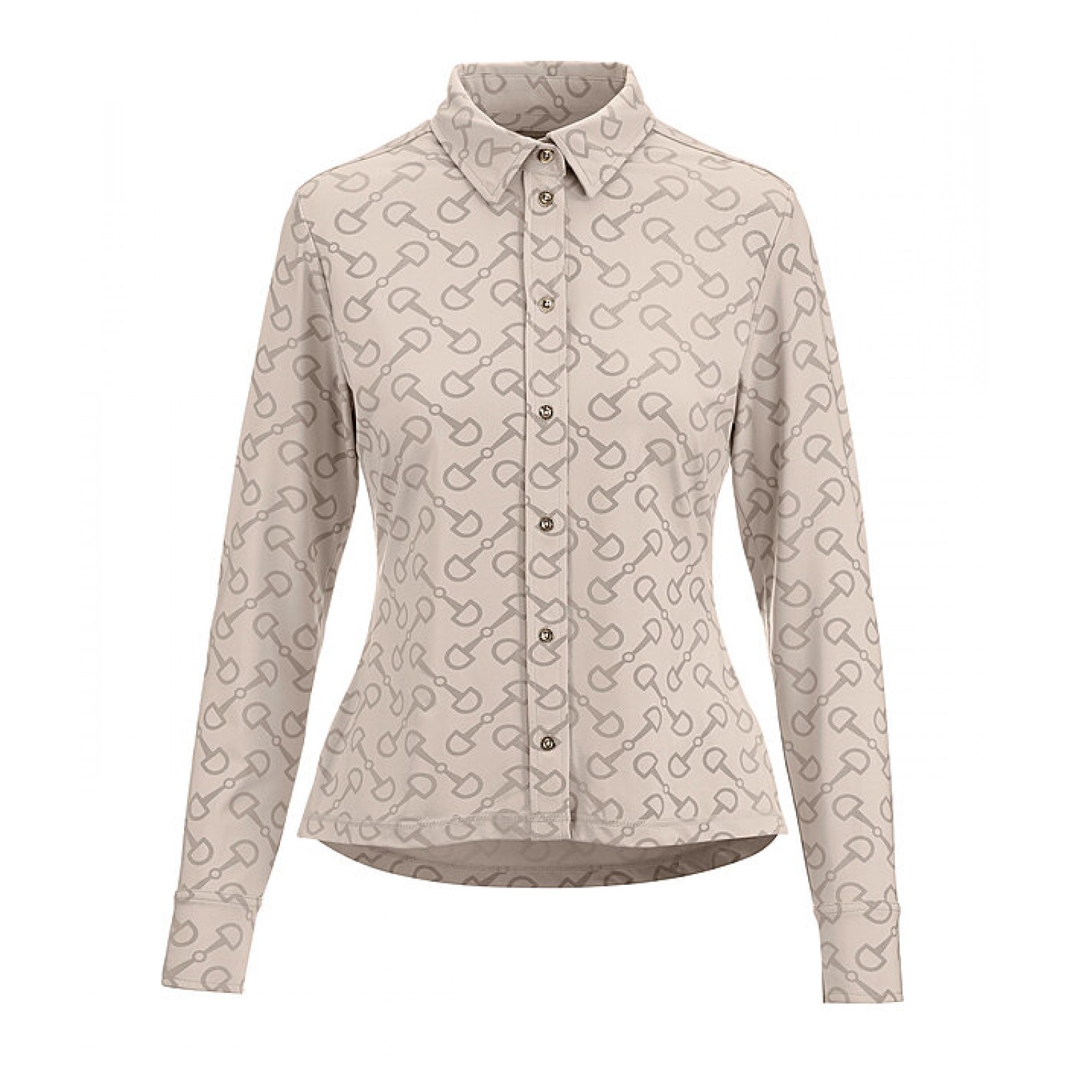 Элегантная эластичная блузка из дышащей и быстросохнущей ткани с принтом по всей поверхности. Планка и пуговицы на манжетах. Состав: 85% полиэстер, 15% эластан.