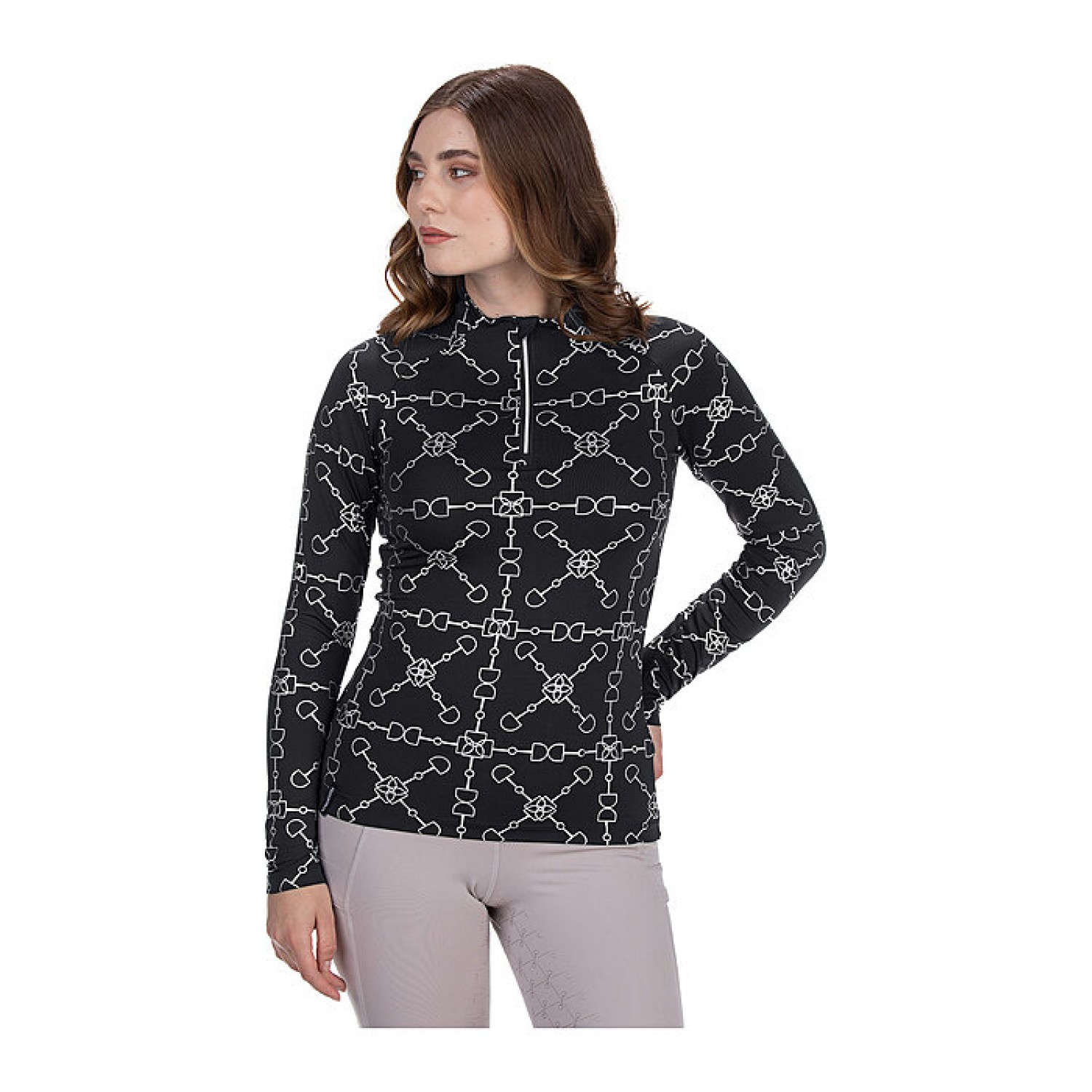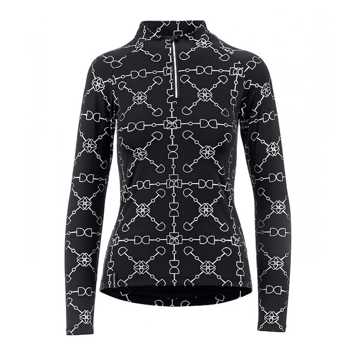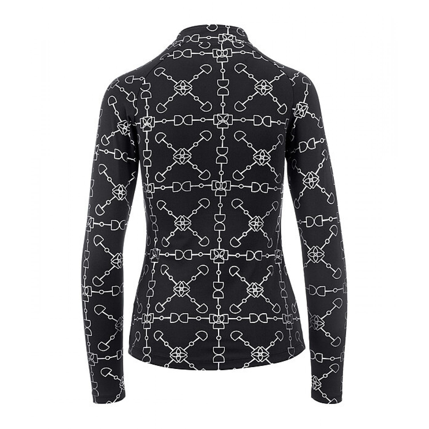Стильная спортивная рубашка с элегантным глянцевым принтом по всей поверхности. Дышащая и быстросохнущая. Рукава реглан и воротник-стойка на молнии с защитой подбородка. Состав: 88% полиэстер, 12% эластан.