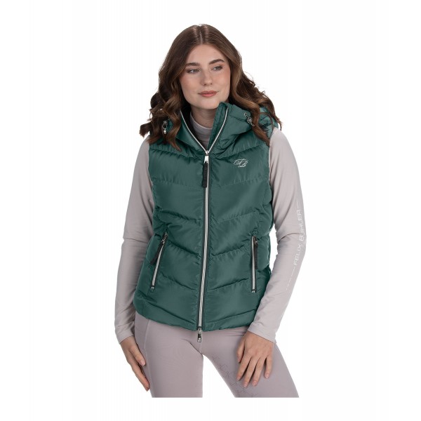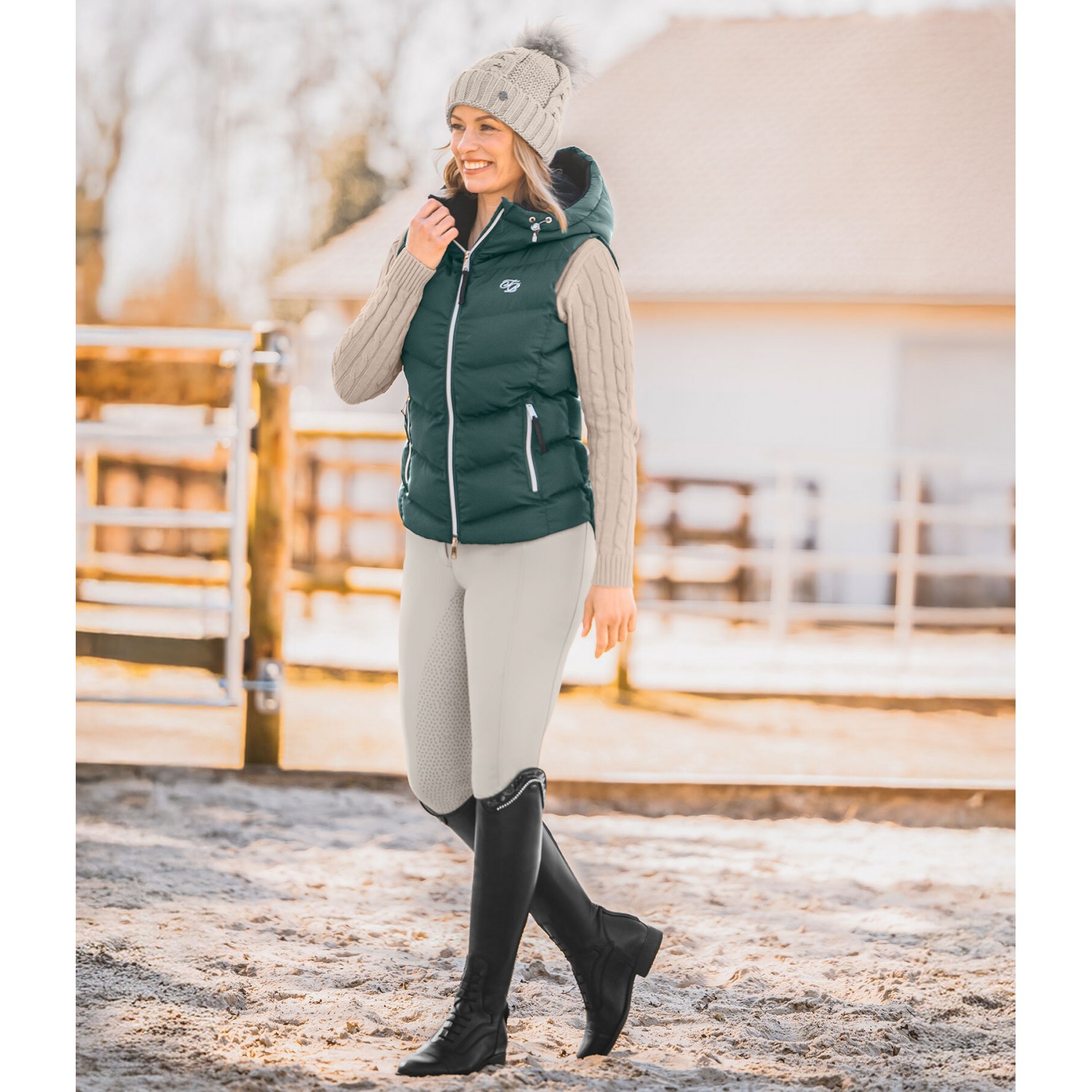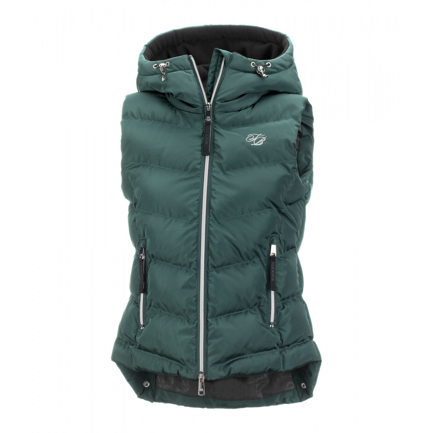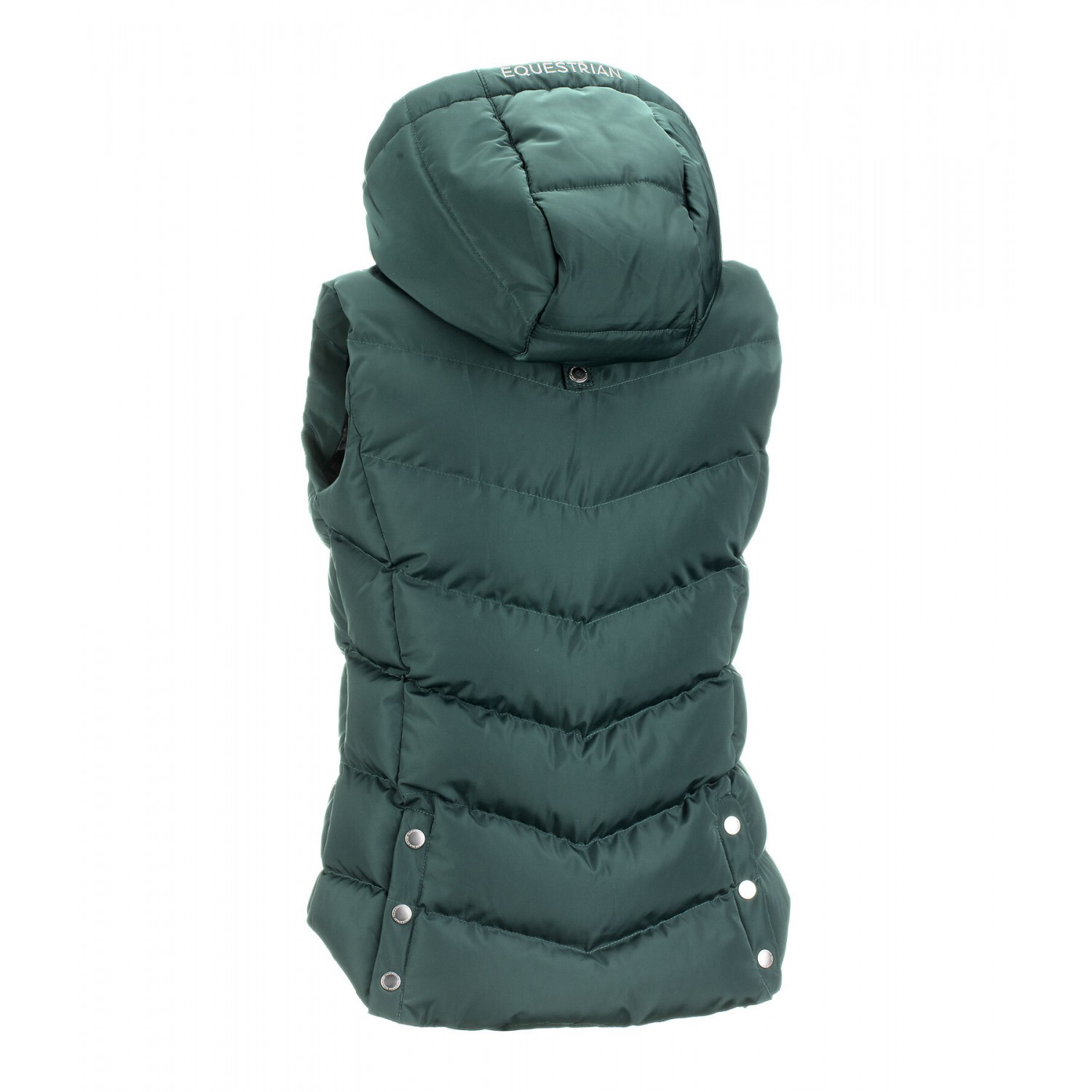 Очень красивый жилет на теплой подкладке с высоким регулируемым капюшоном на флисовой подкладке, который можно прикрепить к спине. Индивидуальный крой с удлиненной спинкой, двумя карманами на молнии спереди, двусторонней молнией спереди с защитой подбородка и двумя разрезами для верховой езды на кнопках сзади. Мягкий наполнитель, имитирующий пух. Качественная вышивка на груди и капюшоне. 100% полиэстер.