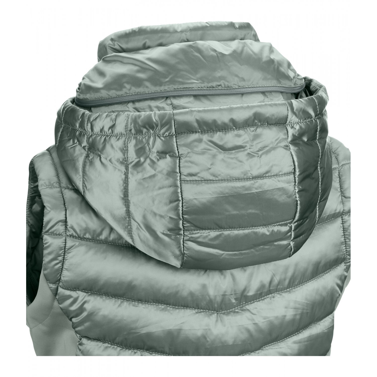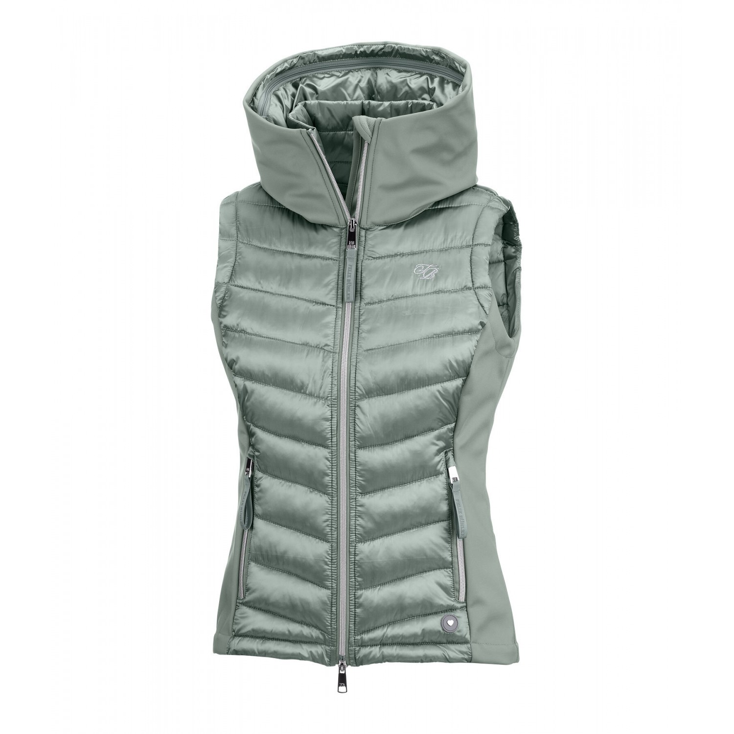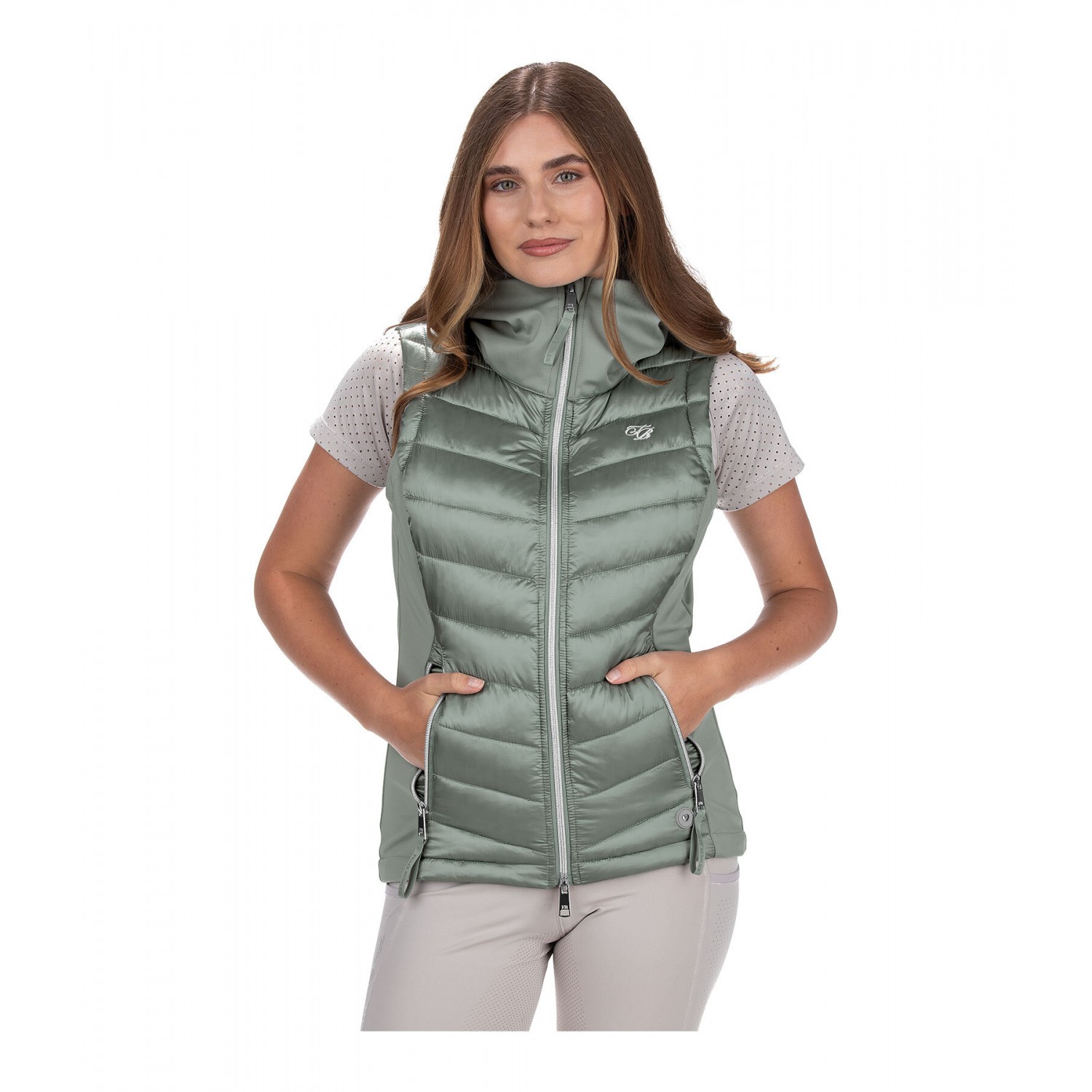 Ветрозащитный, элегантный комбинированный жилет для верховой езды из мягкого, мерцающего стеганого материала с легким наполнителем и боковыми вставками, а также воротником-стойкой из эластичного софтшелла. Стеганый капюшон можно убрать в большой внешний воротник на молнии. Блестящая двухсторонняя молния спереди с подкладкой, защитой подбородка и 2 карманами на молнии спереди. Регулируемая ширина подола. Стеганый материал 100% нейлон, вставки softshell 92% полиэстер и 8% эластан.