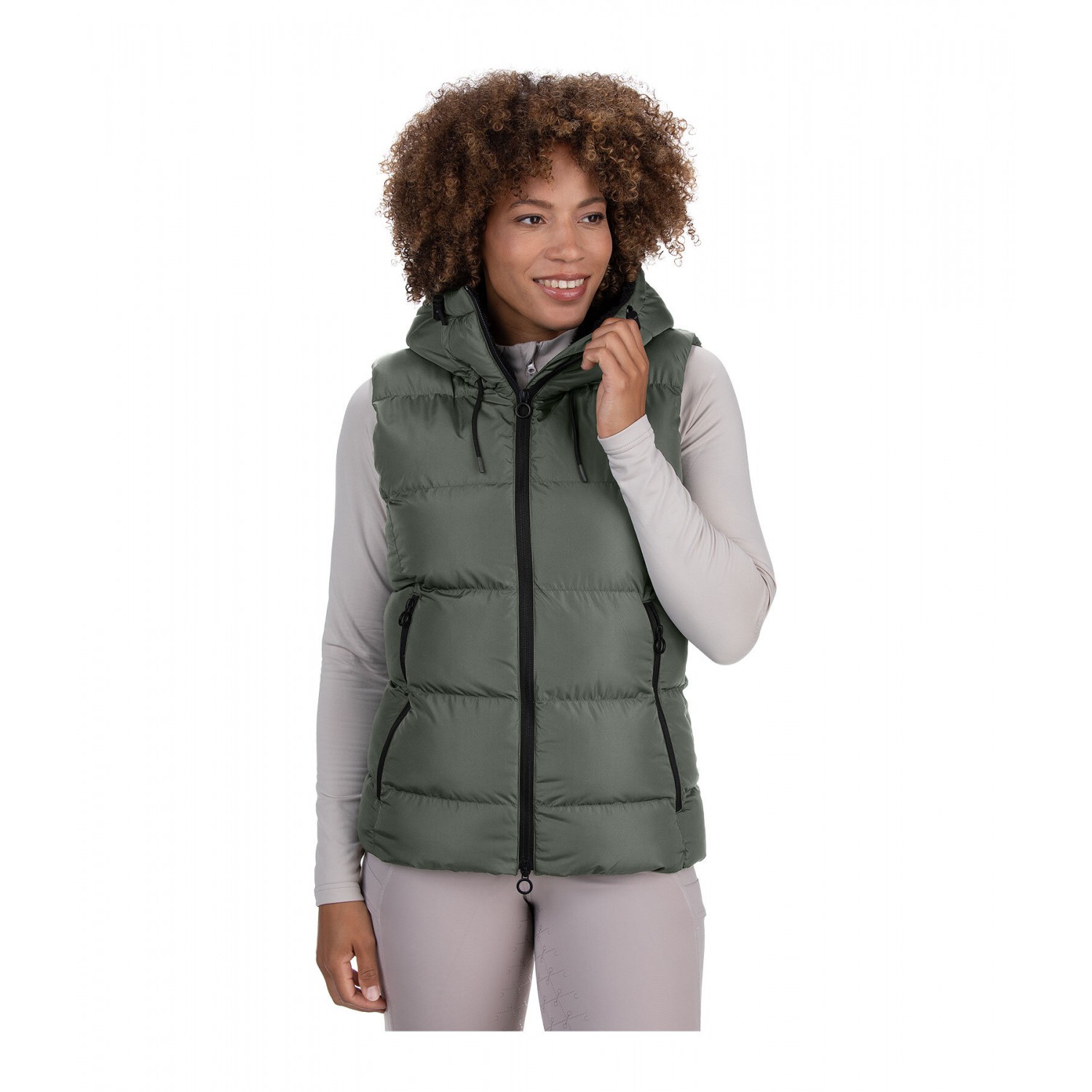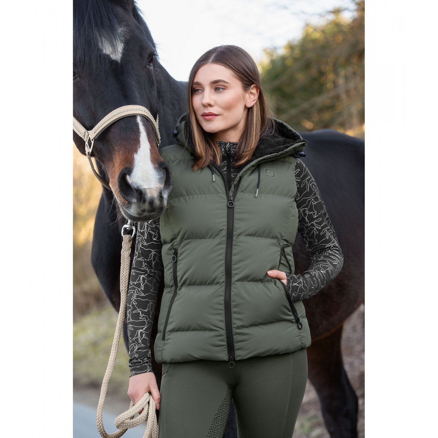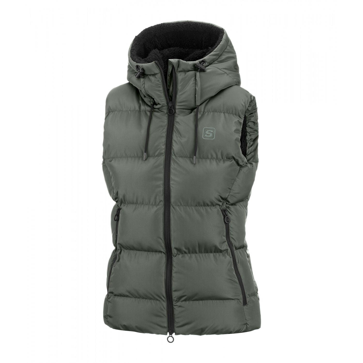 Теплый, уютный стеганый жилет с внутренней подкладкой из мягкого флиса и особо мягким наполнителем из искусственного пуха. Очень высокий регулируемый капюшон прикрепляется к спине с помощью кнопки. Он также имеет подкладку из флиса. Двусторонняя молния под подкладкой спереди с защитой подбородка, 2 передних кармана на молнии, 1 внутренний карман, эластичный низ и значок STEEDS на груди. 100% полиэстер.