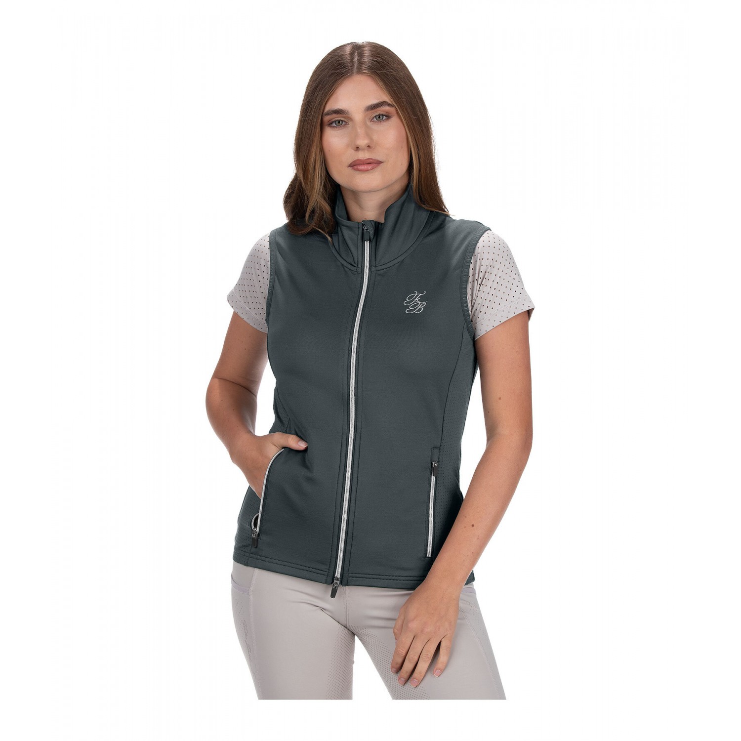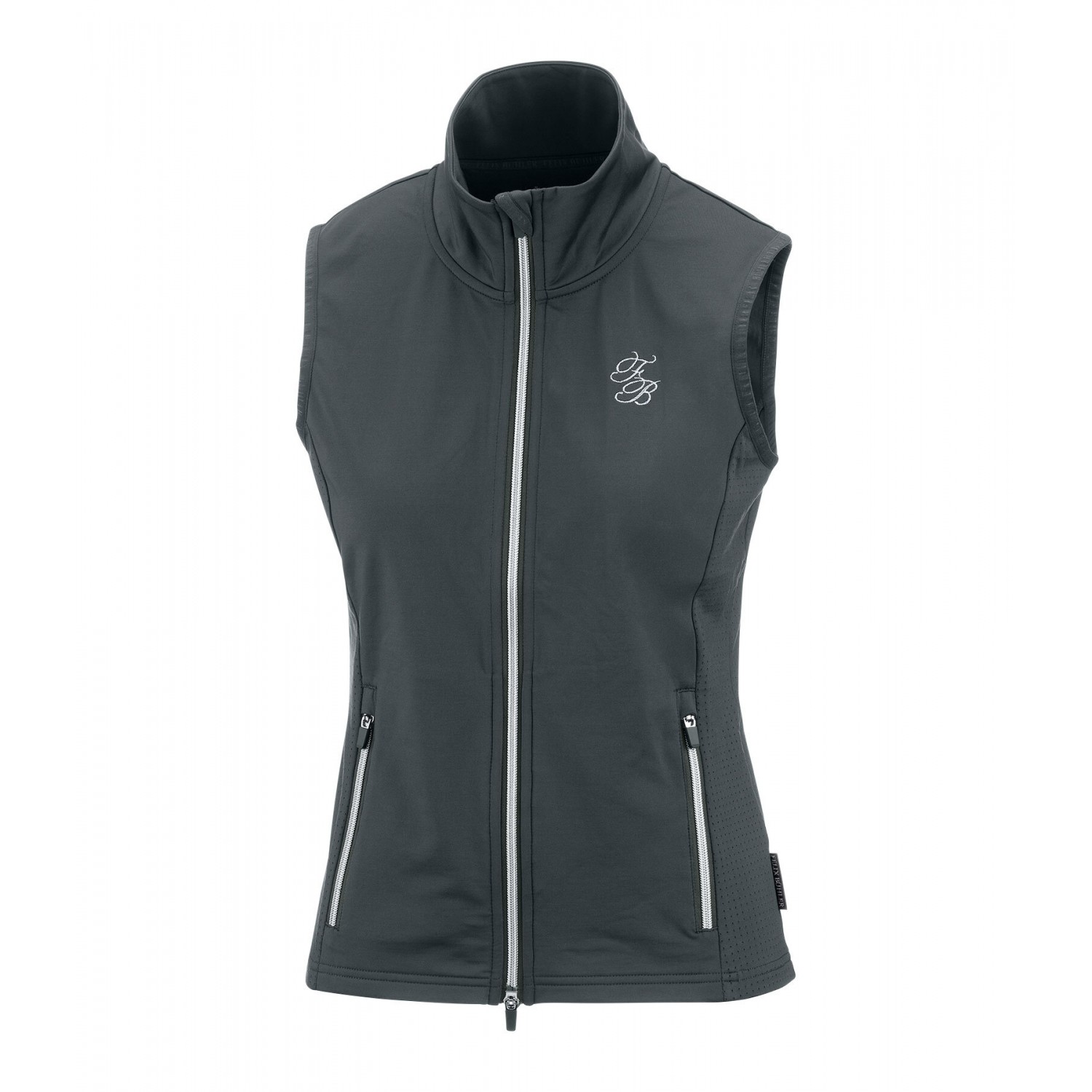 Спортивный, легкий жилет для верховой езды из чрезвычайно эластичного, дышащего и быстросохнущего материала с боковыми вставками, перфорированными лазером. Воротник-стойка, двухсторонняя молния спереди с подкладкой и защитой подбородка, 2 кармана на молнии спереди и элегантная вышивка логотипа на груди и воротнике. 90% полиэстер, 10% эластан.