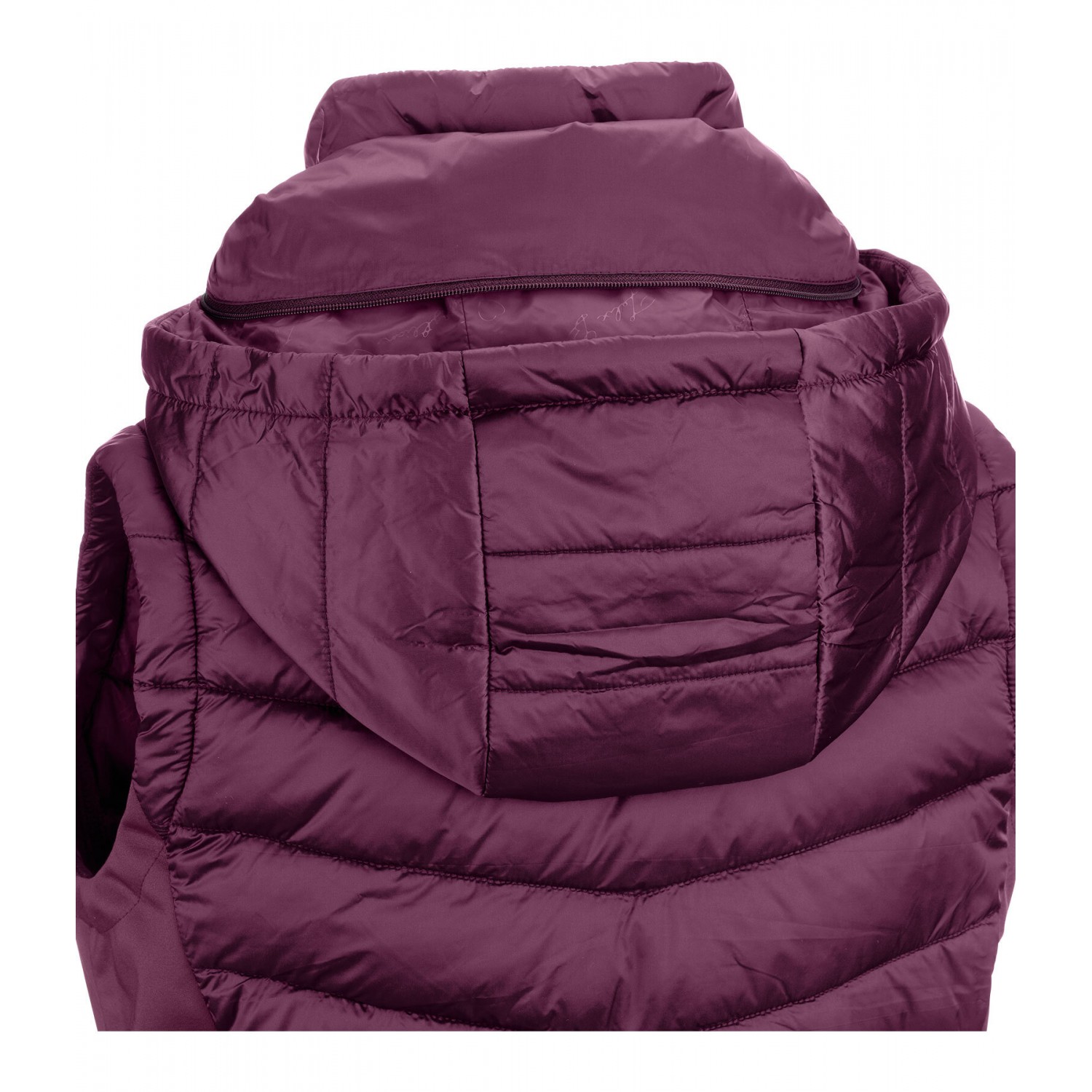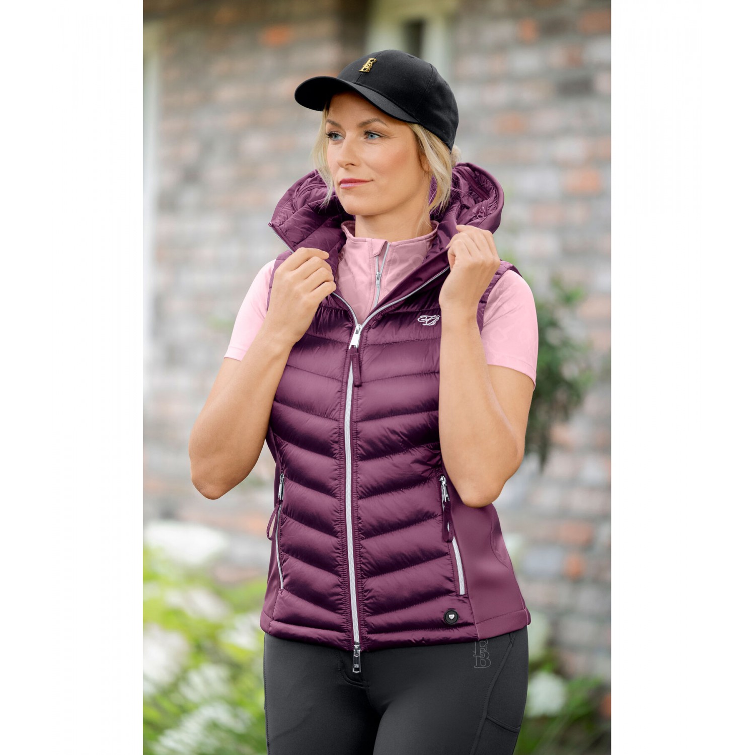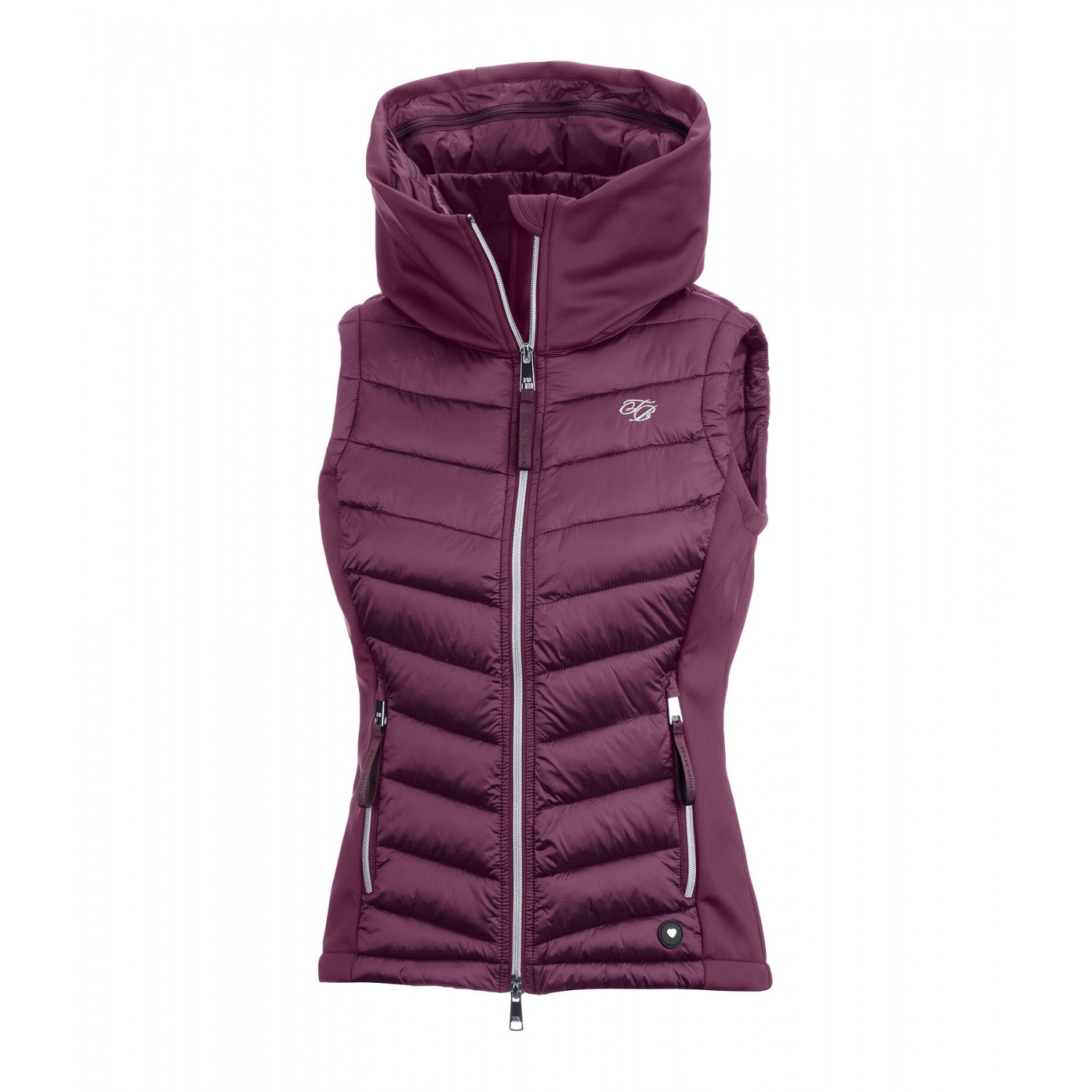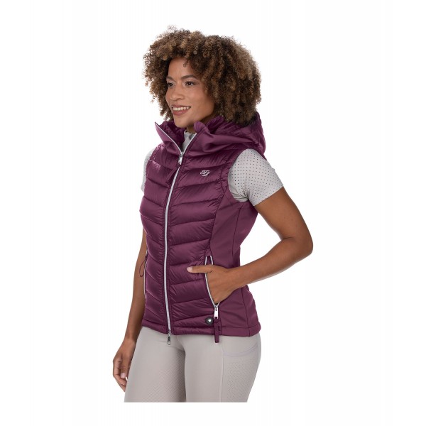 Ветрозащитный, элегантный комбинированный жилет для верховой езды из мягкого, мерцающего стеганого материала с легким наполнителем и боковыми вставками, а также воротником-стойкой из эластичного софтшелла. Стеганый капюшон можно убрать в большой внешний воротник на молнии. Блестящая двухсторонняя молния спереди с подкладкой, защитой подбородка и 2 карманами на молнии спереди. Регулируемая ширина подола. Стеганый материал 100% нейлон, вставки softshell 92% полиэстер и 8% эластан.