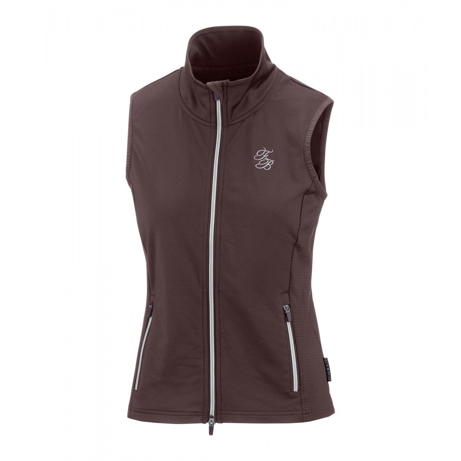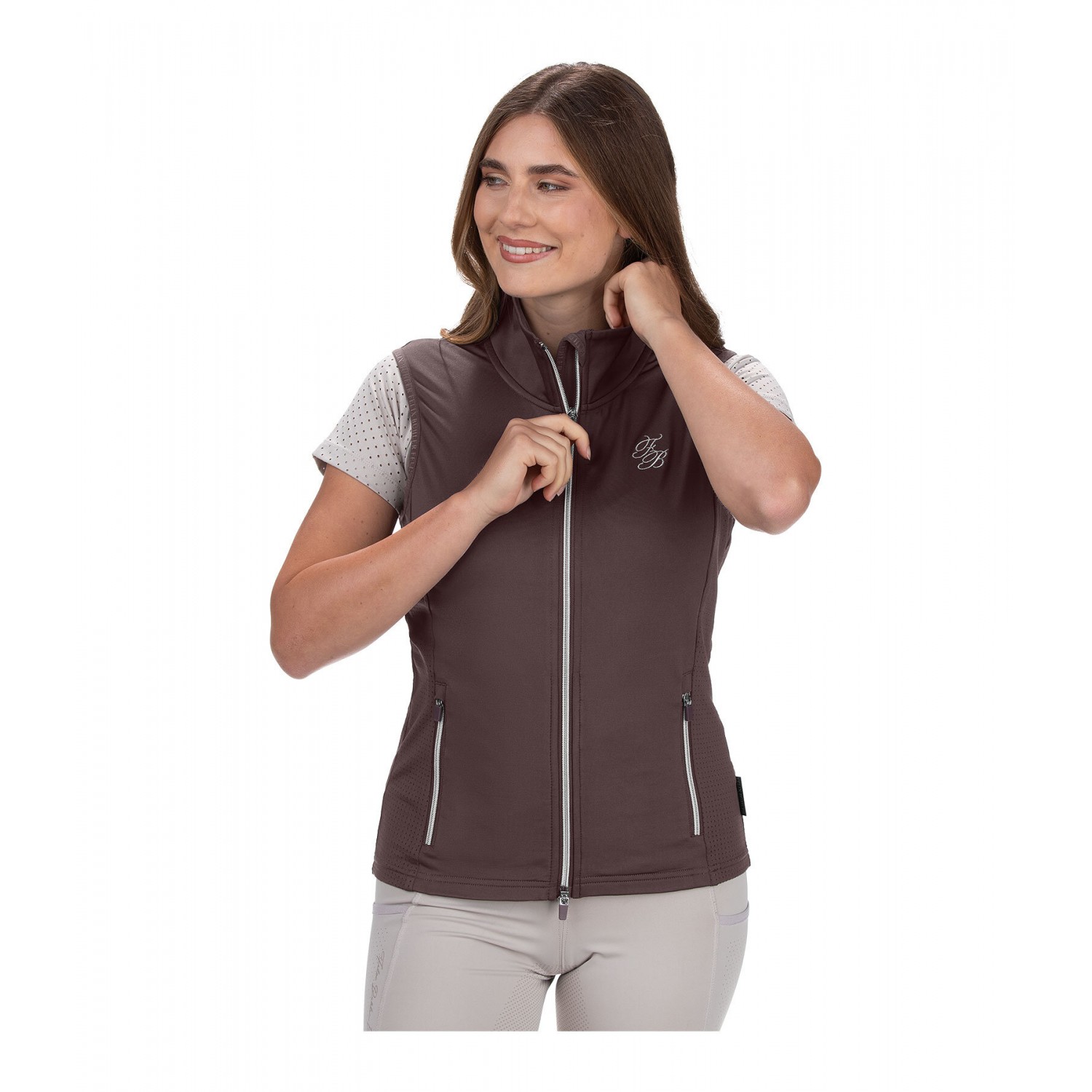 Спортивный, легкий жилет для верховой езды из чрезвычайно эластичного, дышащего и быстросохнущего материала с боковыми вставками, перфорированными лазером. Воротник-стойка, двухсторонняя молния спереди с подкладкой и защитой подбородка, 2 кармана на молнии спереди и элегантная вышивка логотипа на груди и воротнике. 90% полиэстер, 10% эластан.