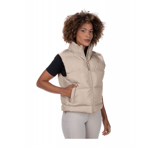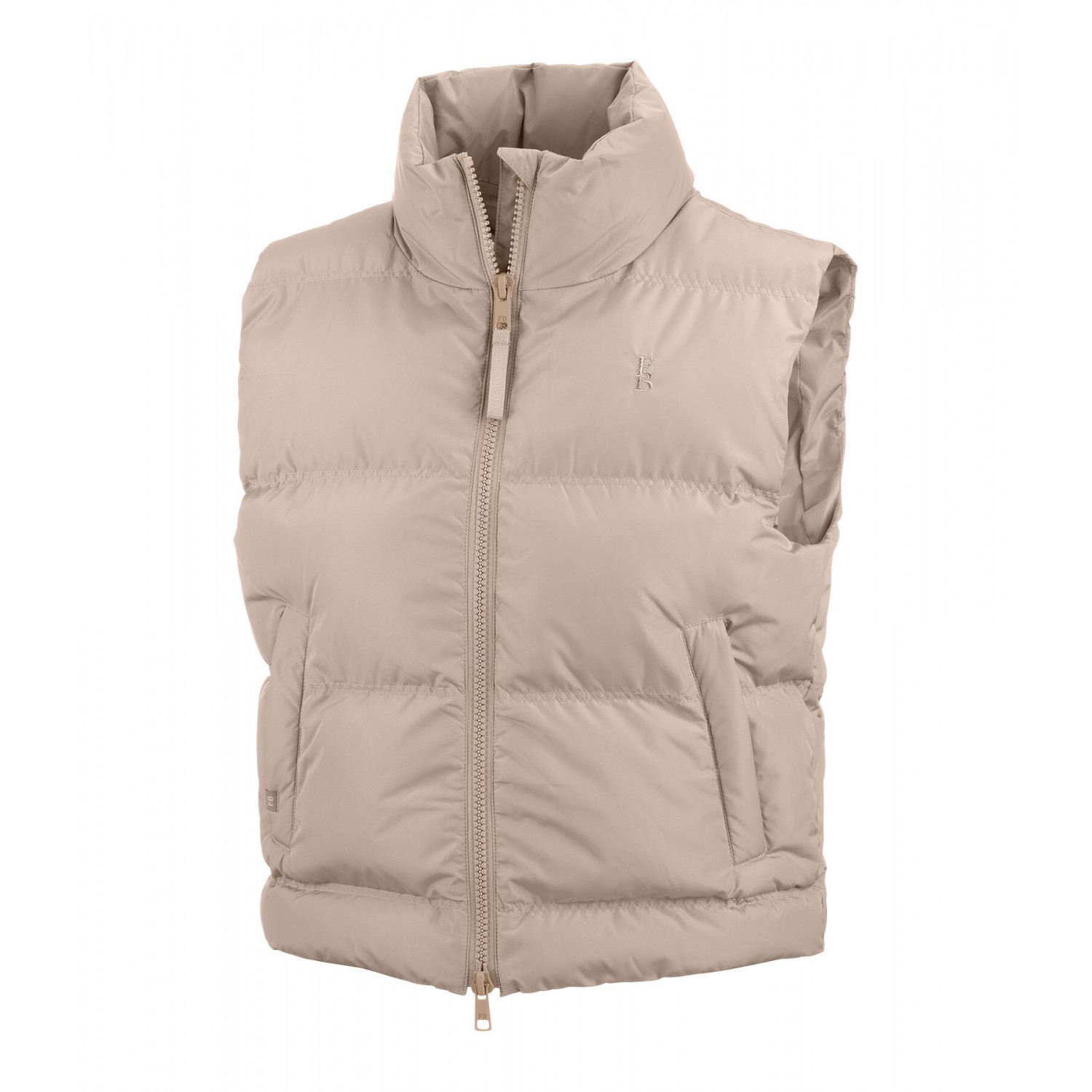 Стильный короткий стеганый жилет со стоячим воротником и легким наполнителем, имитирующим пух. Имеет подкладку, двустороннюю молнию спереди с защитой подбородка, два потайных передних кармана на молнии, вышивку Felix Bühler на груди и регулируемый шнурок по низу. 100% полиэстер.