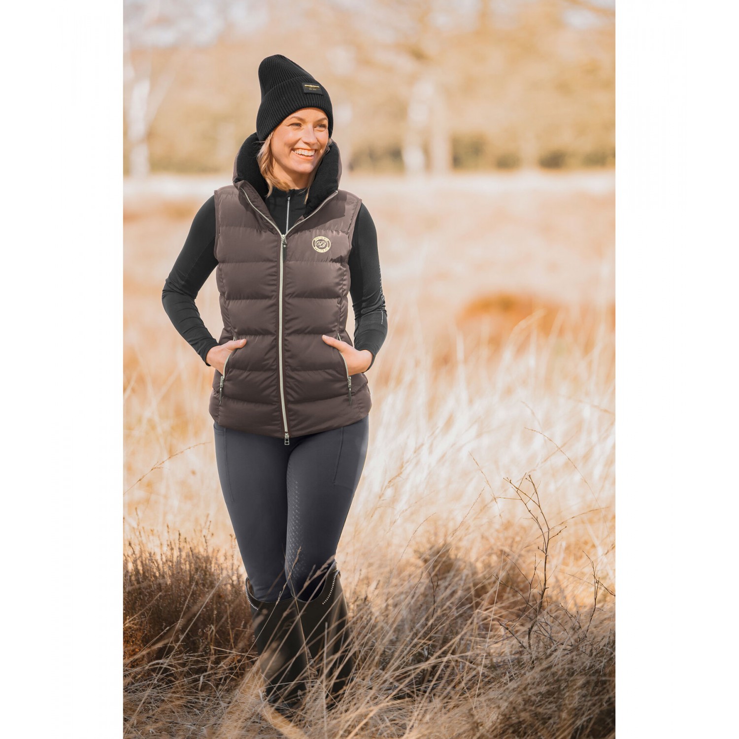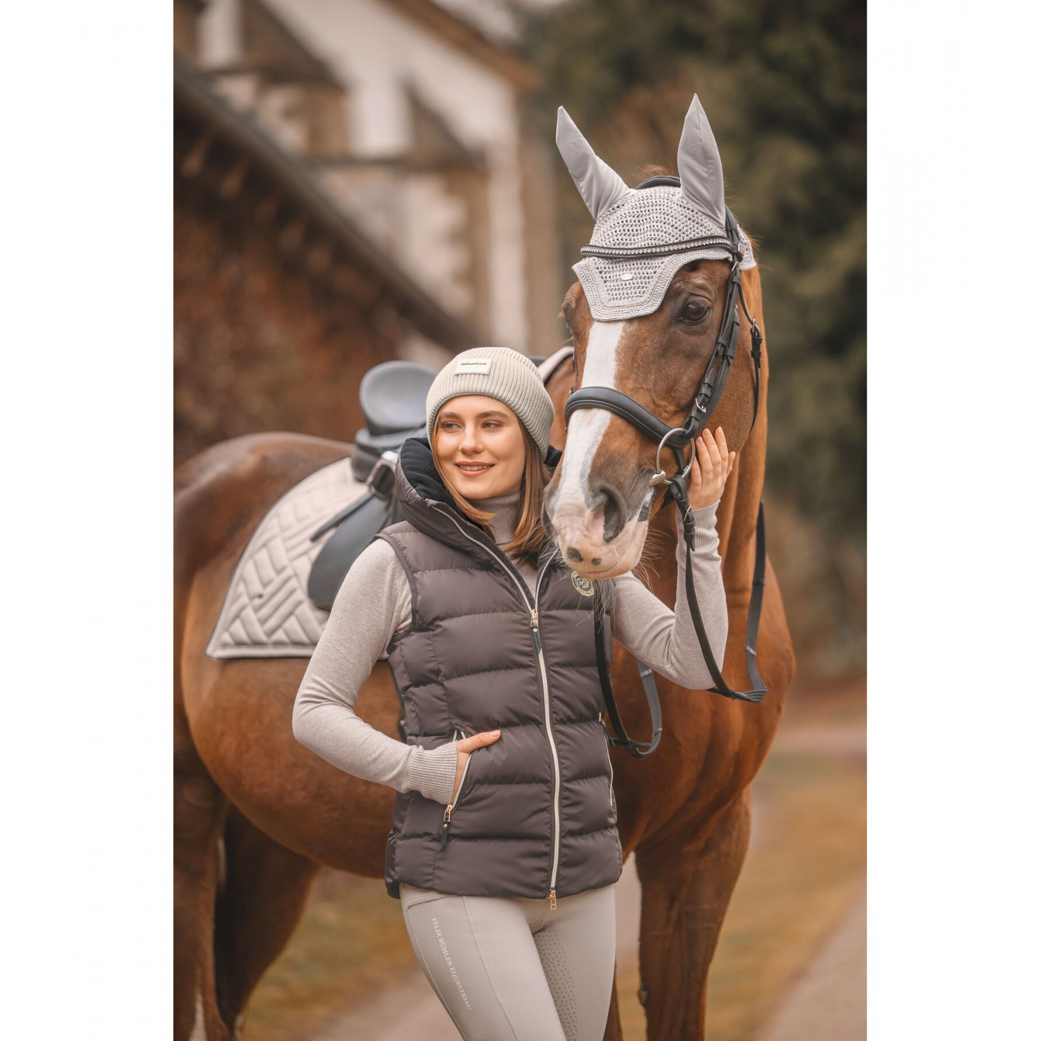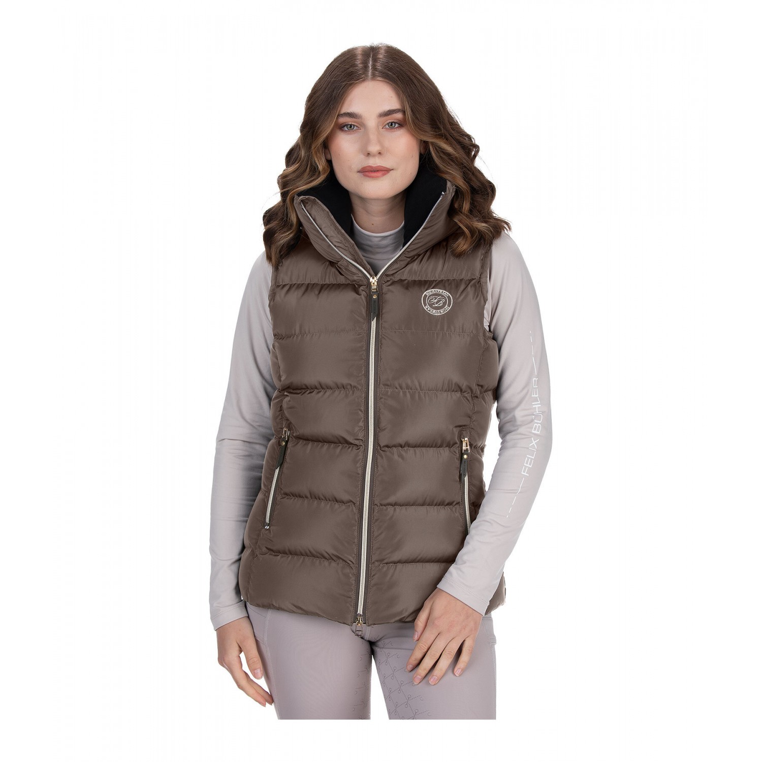 Классический элегантный жилет с очень высоким, объёмным, тёплым воротником с мягкой флисовой подкладкой. Удлинённая спинка. Теплая, мягкая подкладка, двусторонняя молния спереди с подкладкой и защитой подбородка, два передних кармана на молнии и один внутренний карман на молнии. Вышивка Felix Bühler на груди и воротнике. 100% полиэстер.