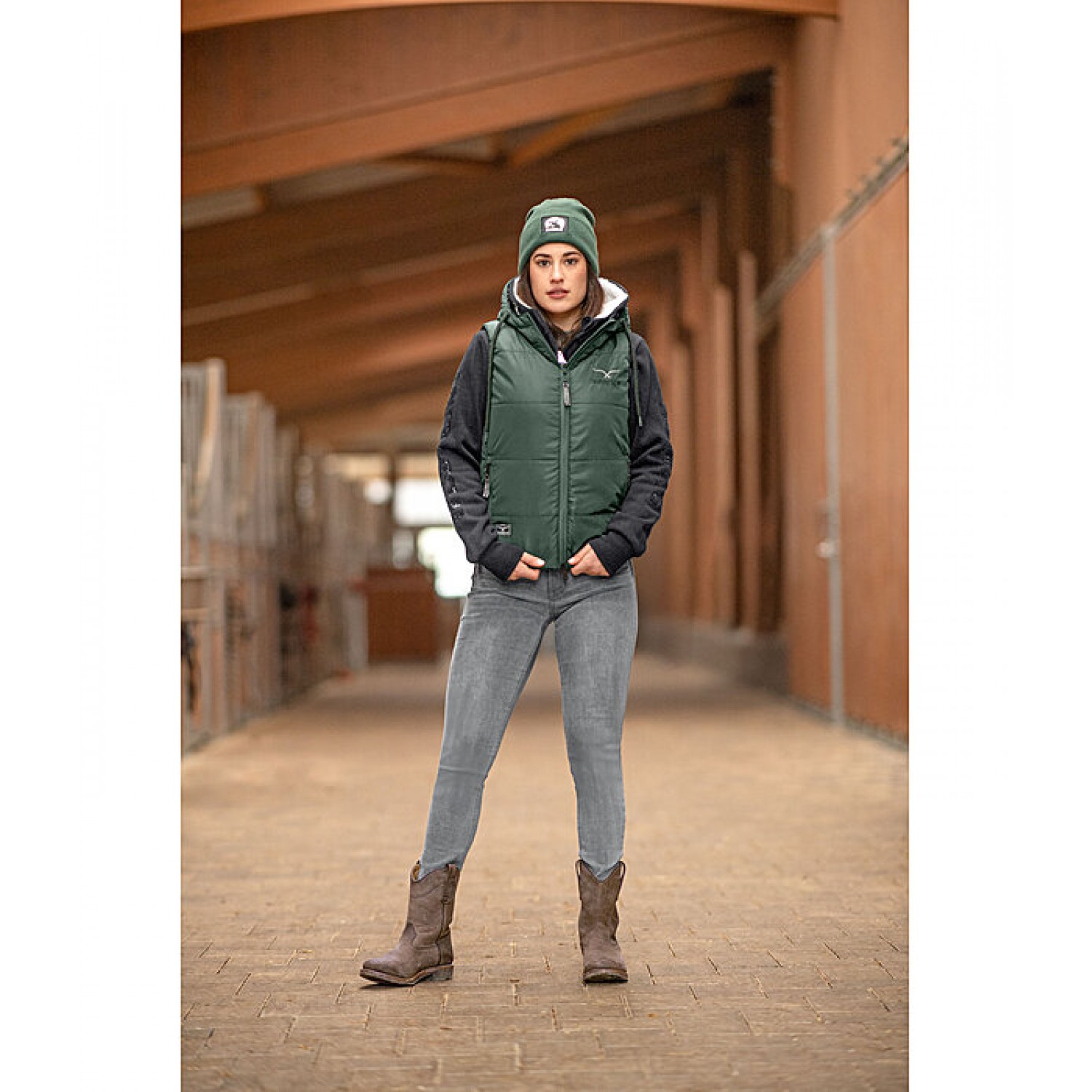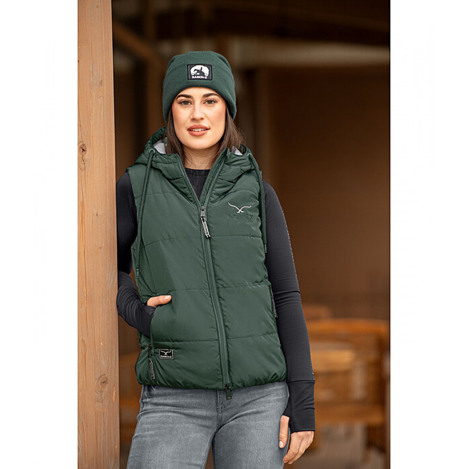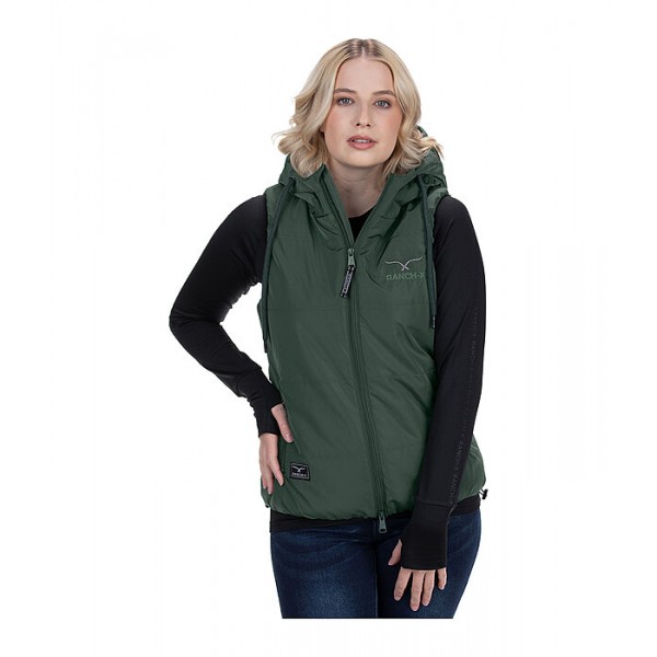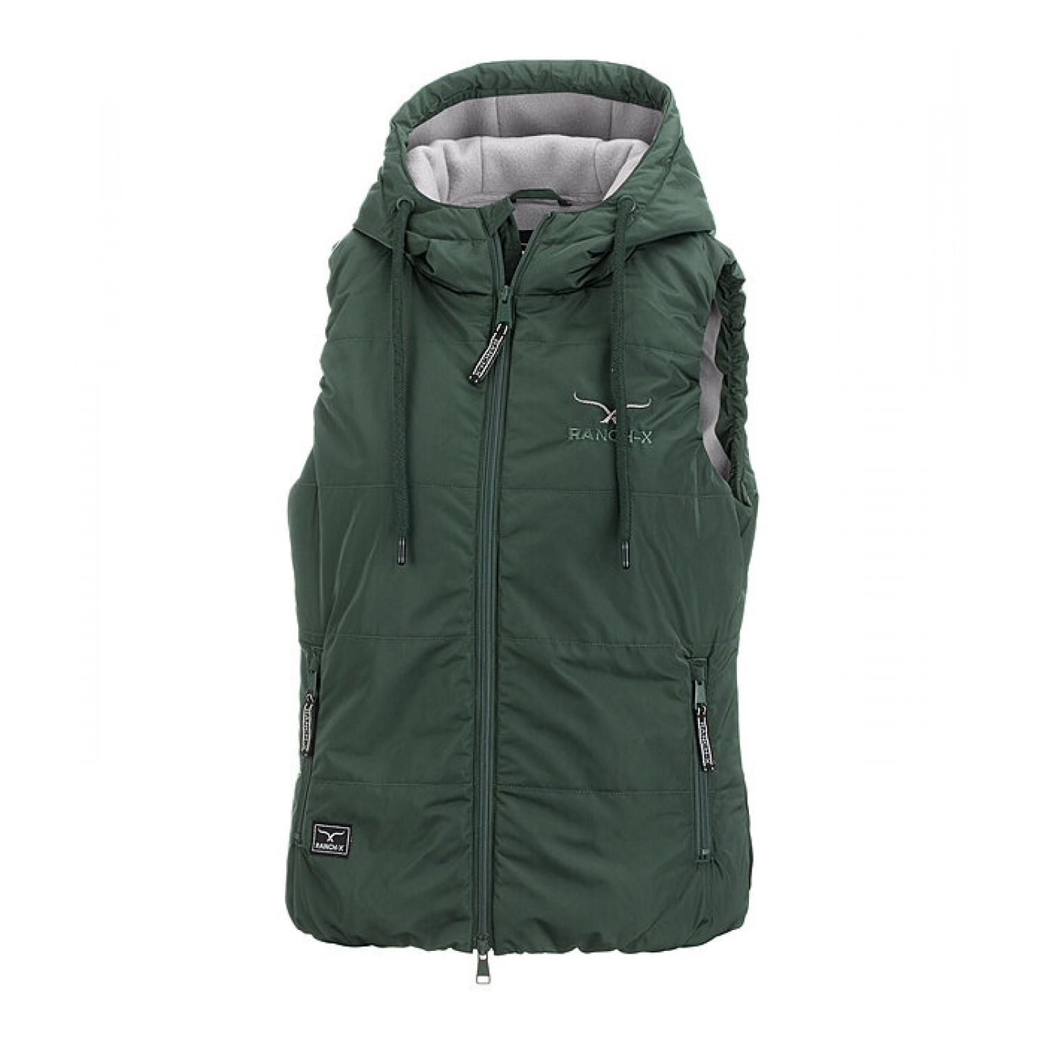 Дышащий, ветрозащитный стеганый жилет с регулируемым капюшоном и мягким наполнителем из искусственного пуха. Блестящий логотип RANCH-X на груди и капюшоне. Двусторонняя молния спереди и передние карманы на молнии. Эластичный регулируемый пояс. 100% полиэстер.