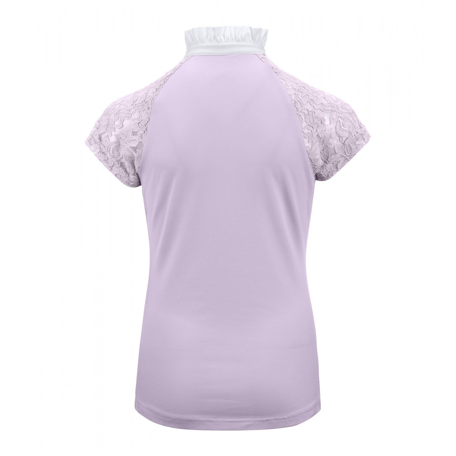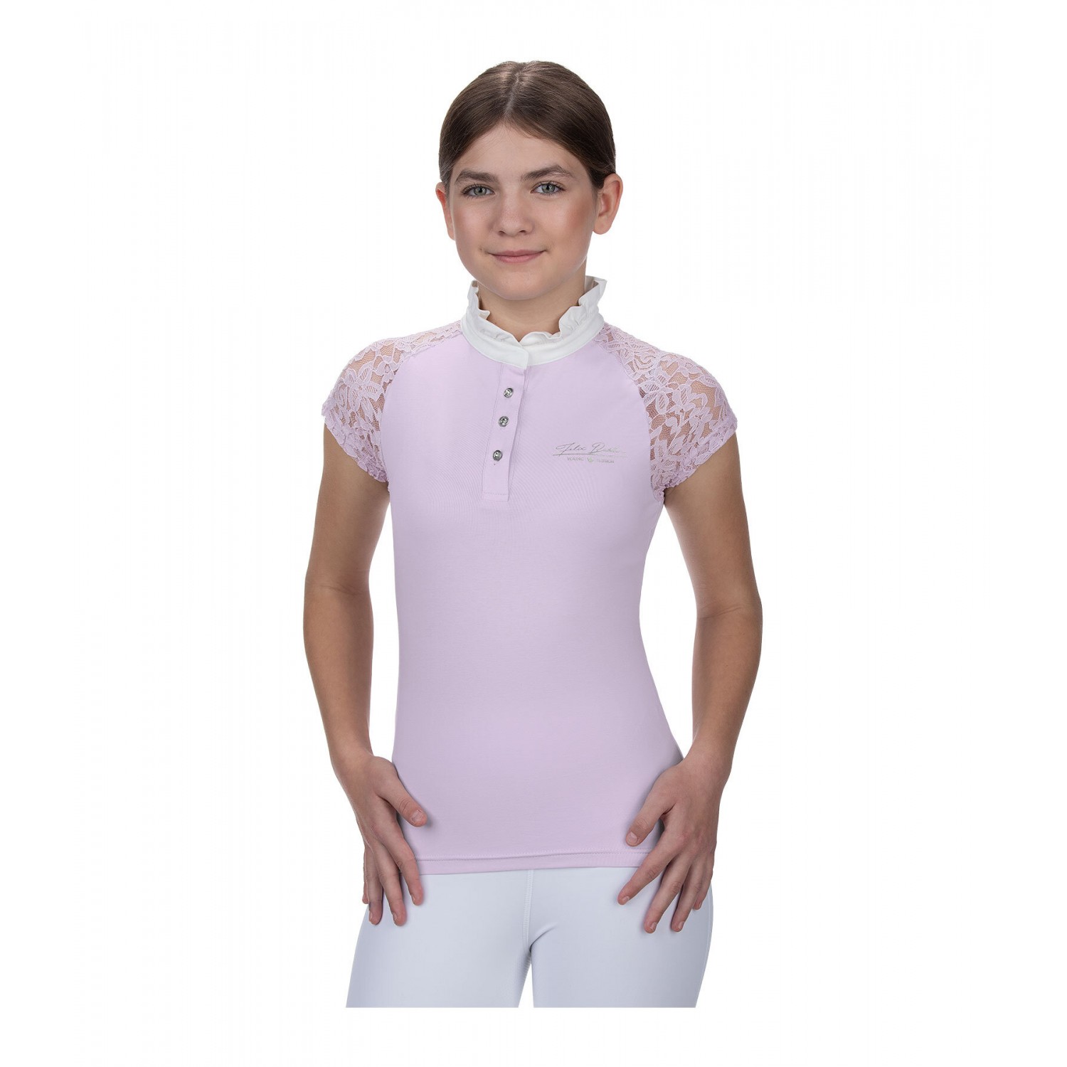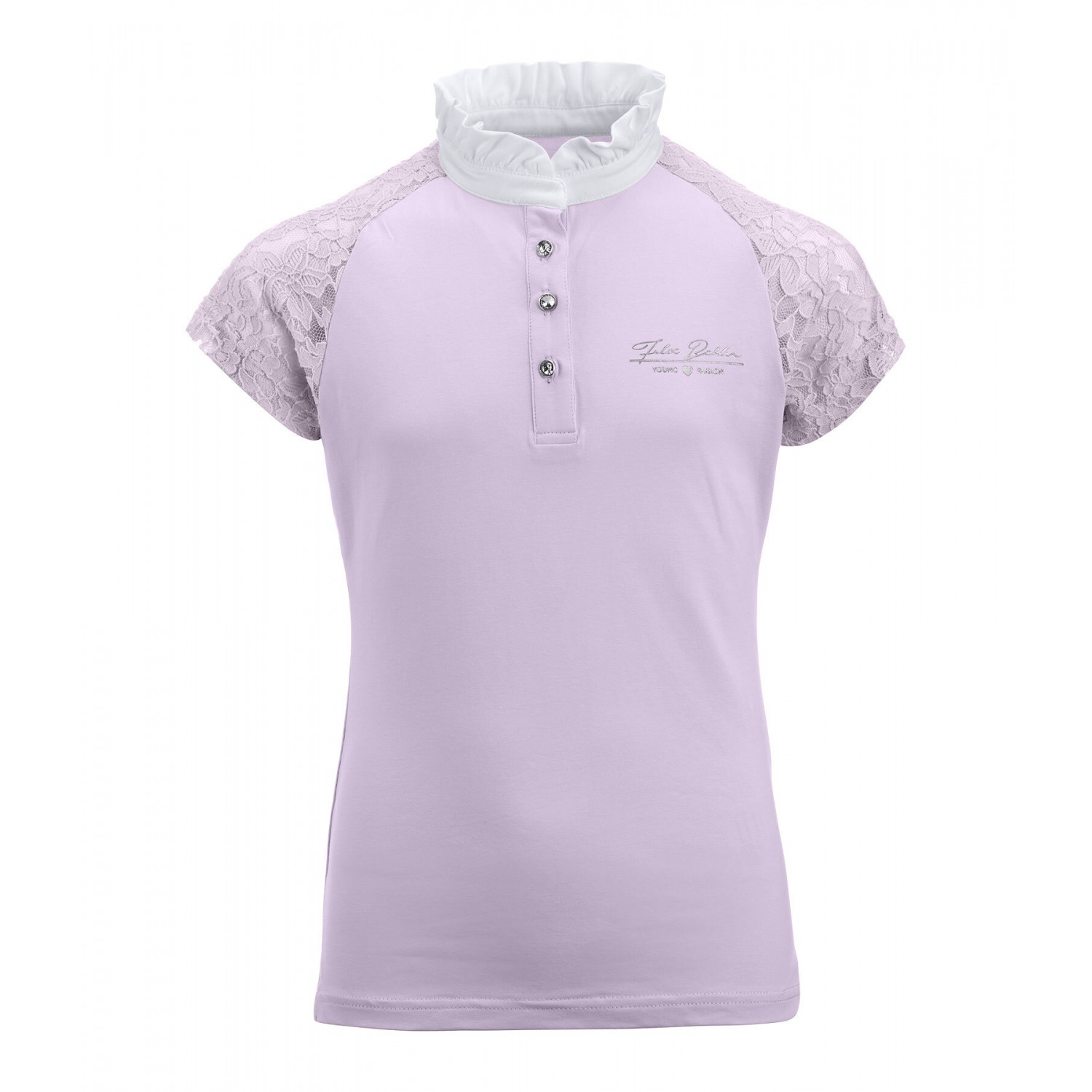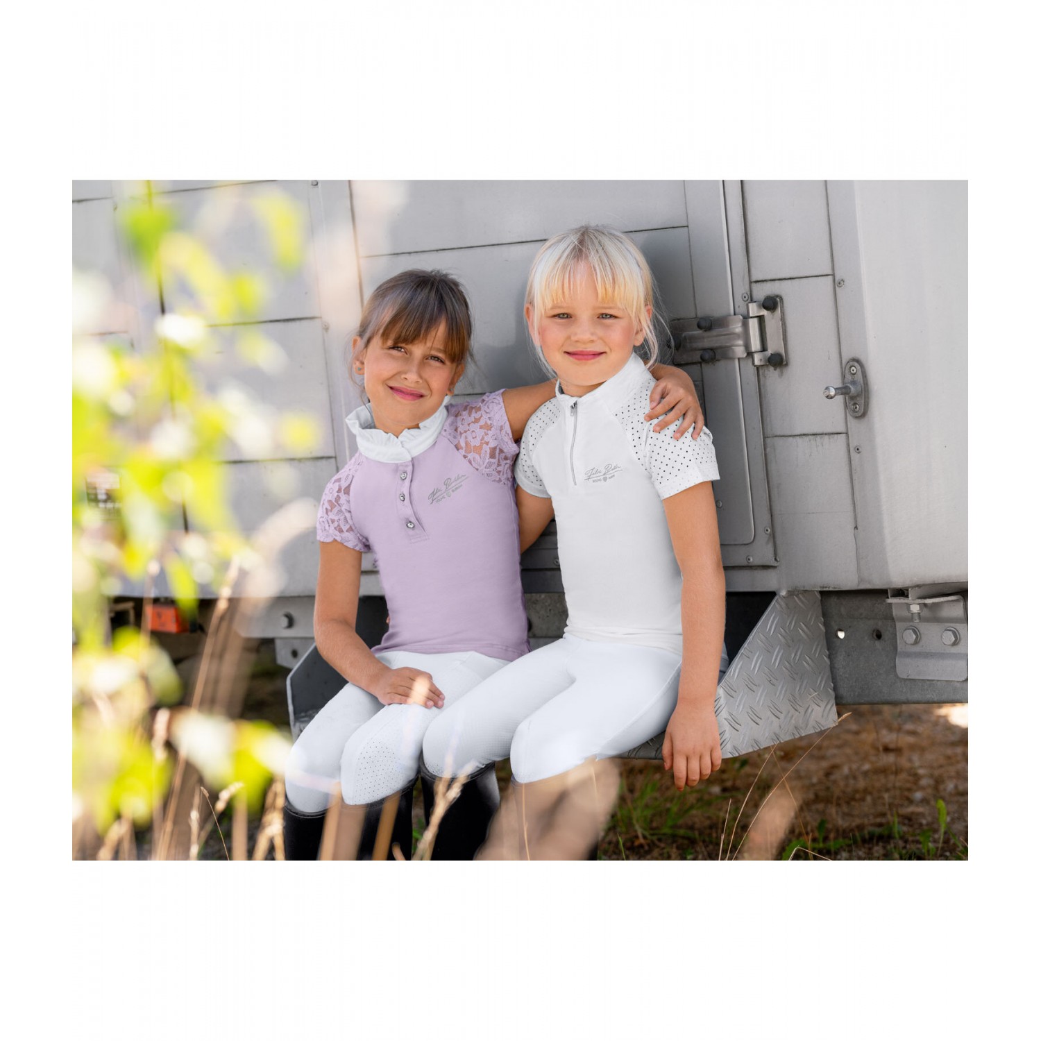 Очень милая детская рубашка из эластичного хлопкового трикотажа с рукавами реглан из тонкого эластичного кружева. Дышащая и быстросохнущая. Белый воротник с рюшами, серебристый принт с логотипом Felix Bühler спереди и эффектная планка с пуговицами. 95% хлопок, 5% спандекс.
