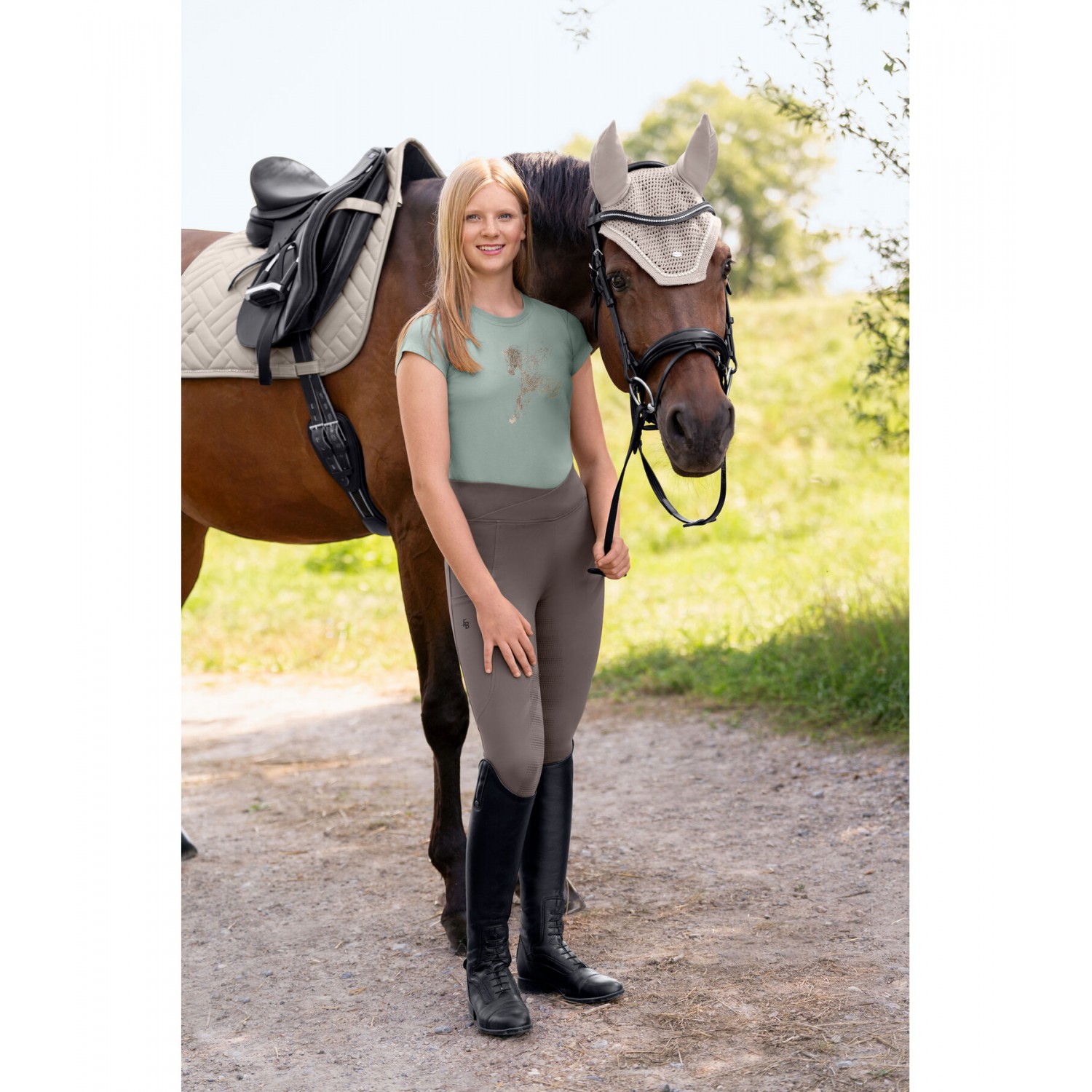 Модные, дышащие детские леггинсы для верховой езды с силиконовой полной леей. Быстросохнущая, эластичная ткань, растягивающаяся в четырех направлениях, удобный перекрестный пояс, логотип на спине и штанине, 2 кармана для мобильных телефонов. 78% полиэстер, 22% эластан.