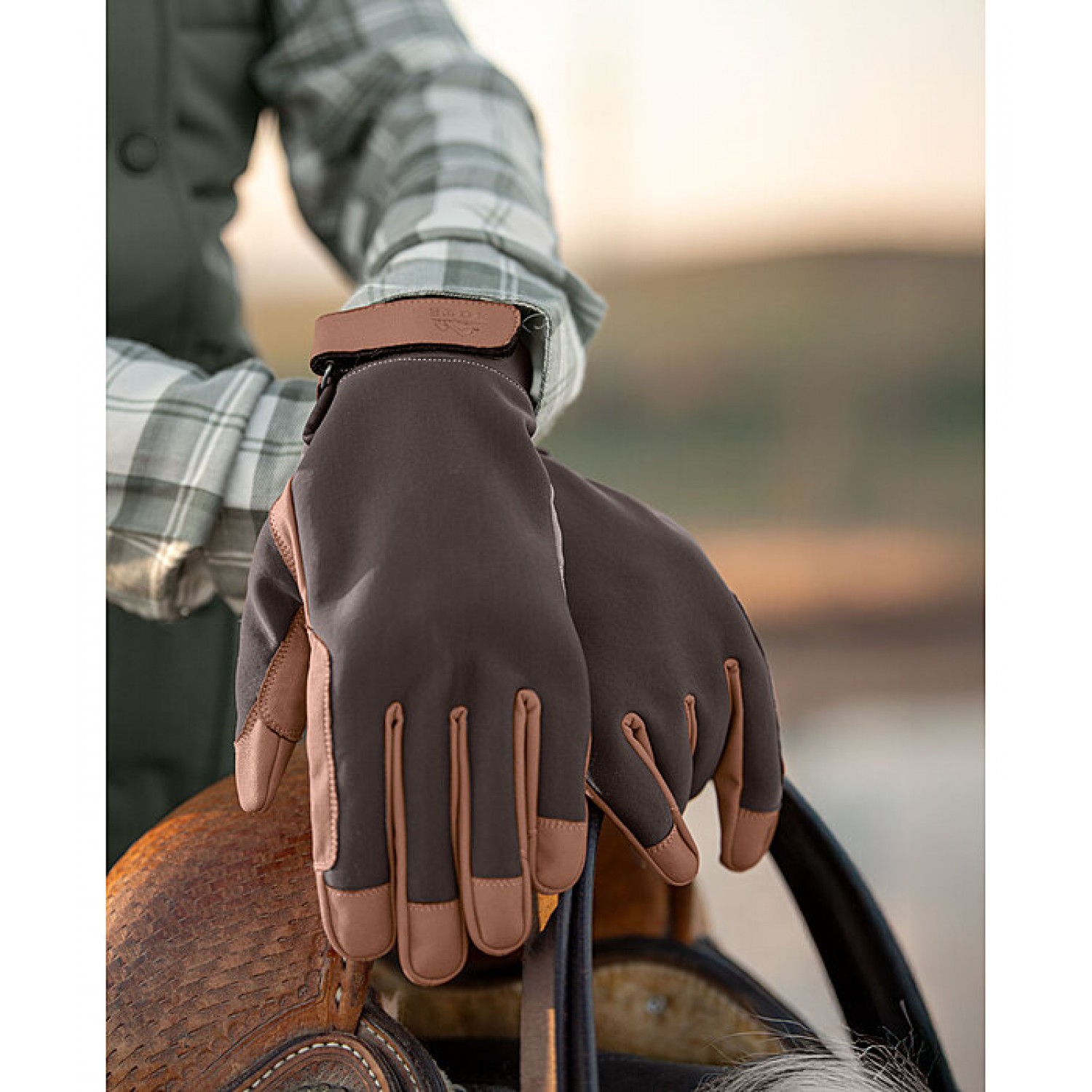 Стильные всесезонные перчатки для верховой езды в стиле вестерн с застежкой-липучкой. Водоотталкивающий материал софтшелл на тыльной стороне ладони, цепкий материал на ладони для необходимого хвата повода. Внешний материал: 100% нейлон. Ладонь: 60% полиэстер, 40% полиуретан.