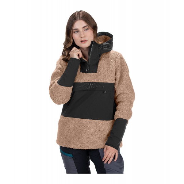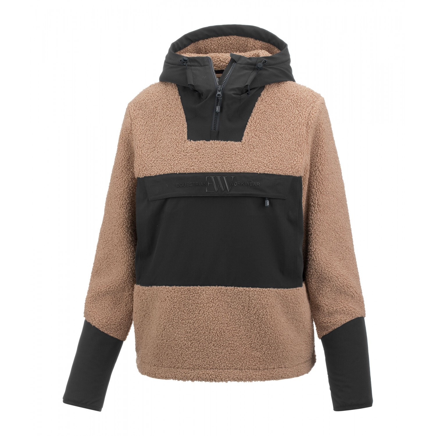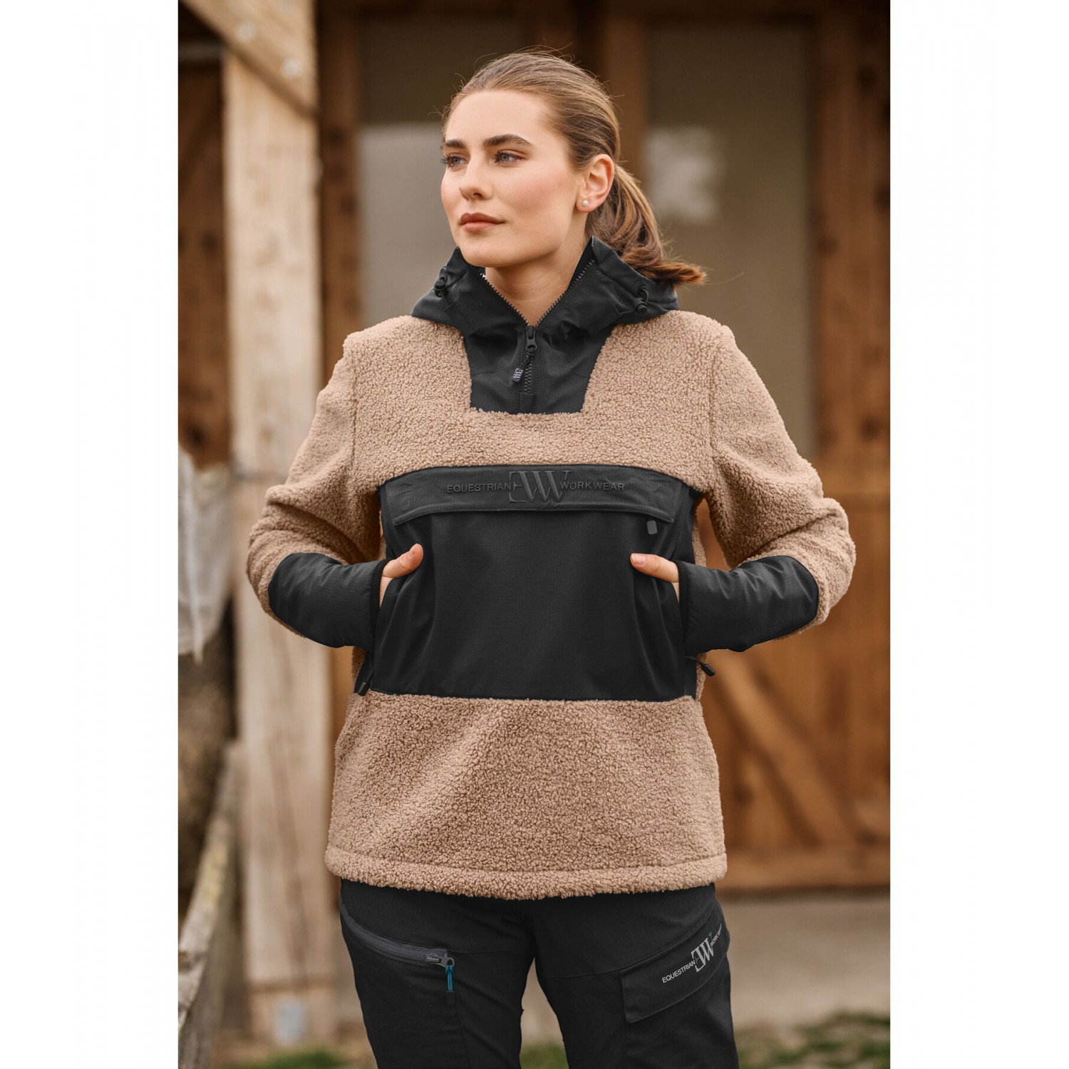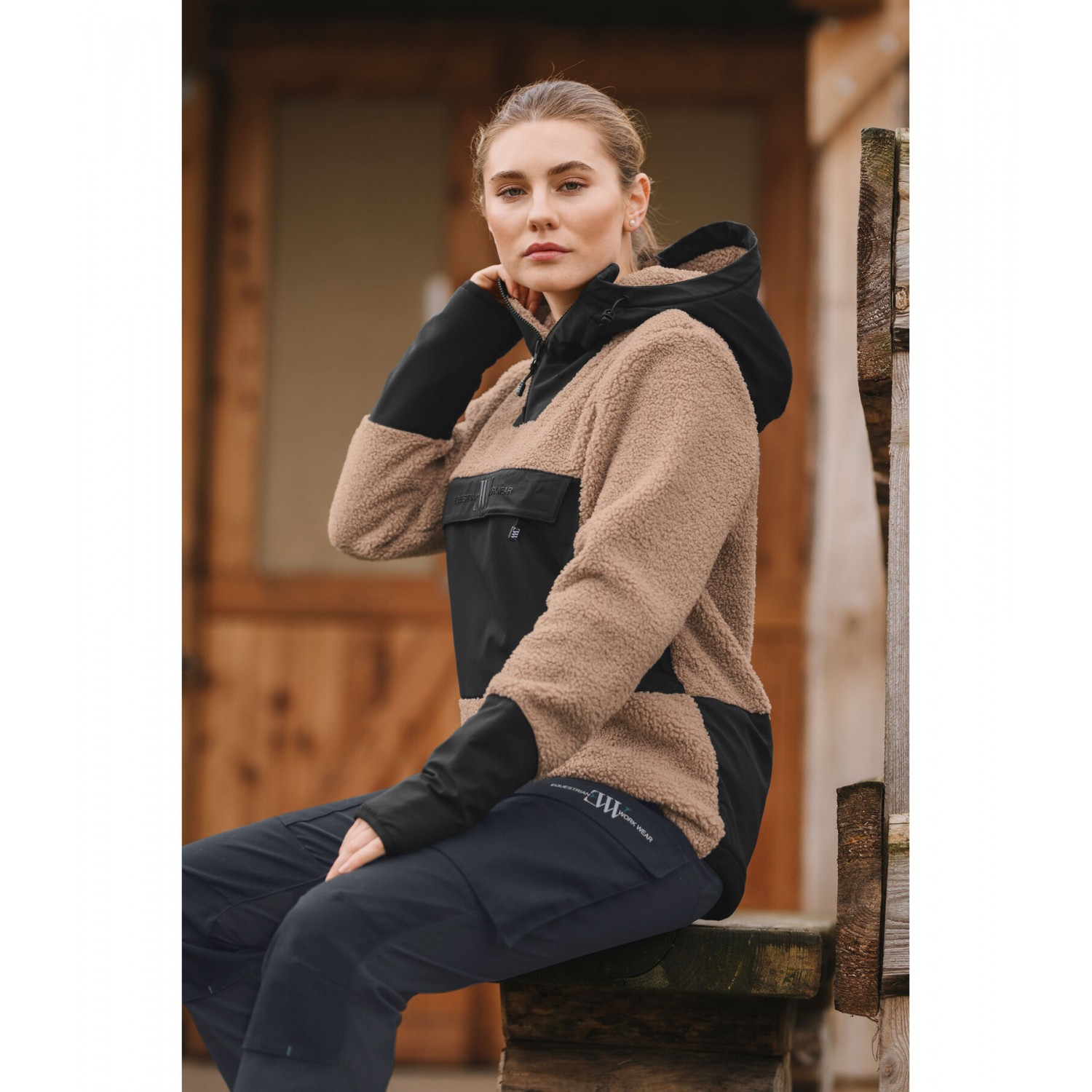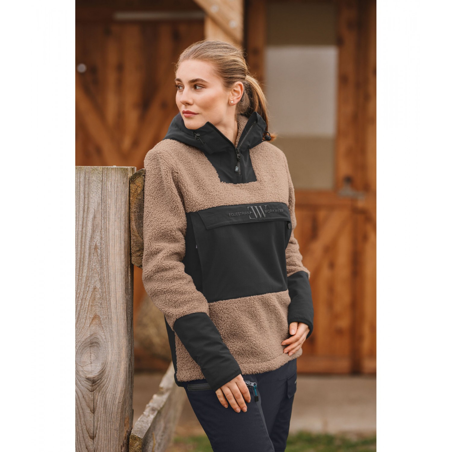 Уютная теплая толстовка из флиса шерпа с регулируемым капюшоном и передней молнией. Внешний материал выполнен из пушистого шерпы, а внутренняя подкладка — из мягкого флиса. Три больших кармана на молнии обеспечивают достаточно места для хранения вещей. Усиления из грязе- и водоотталкивающего материала делают эту толстовку незаменимой для вашей жизни на открытом воздухе, например, в конюшне. 100% полиэстер.