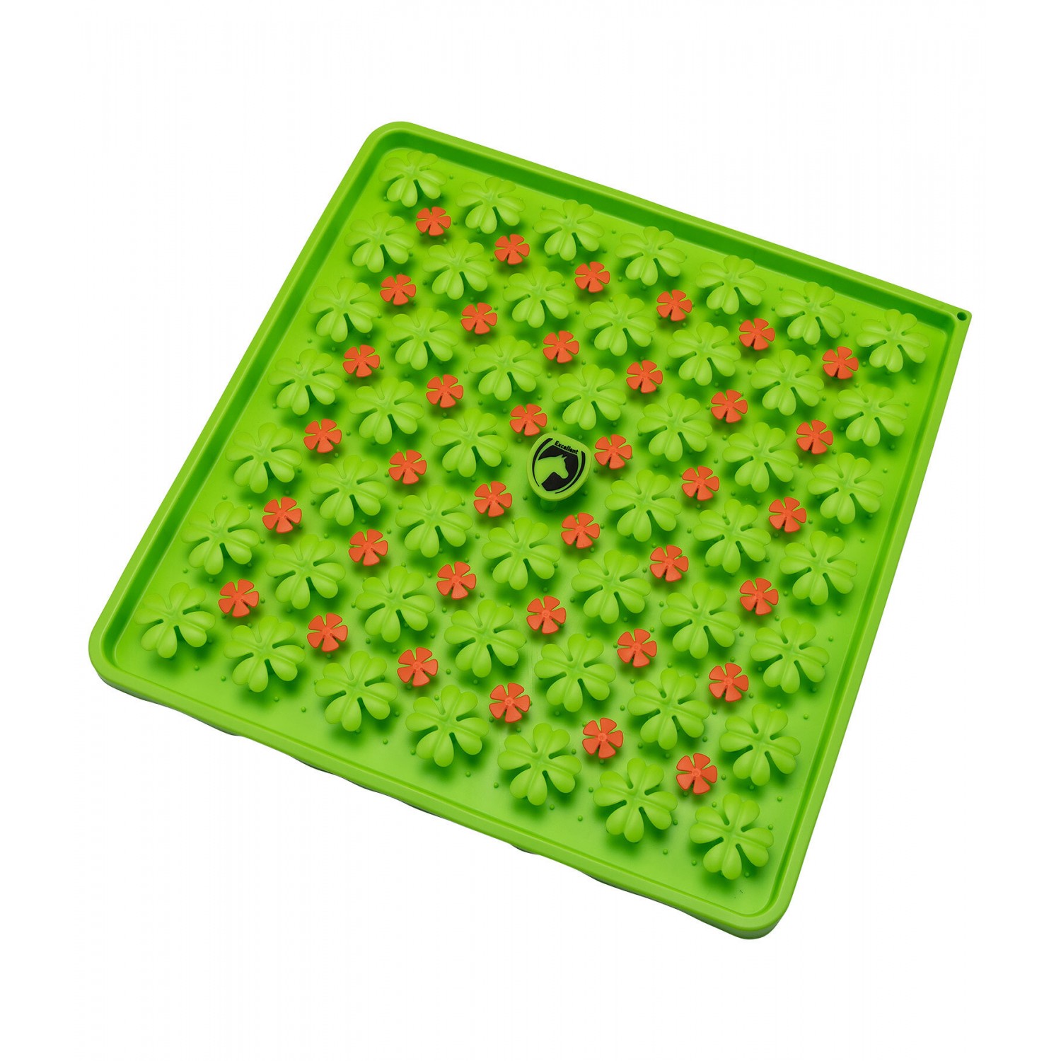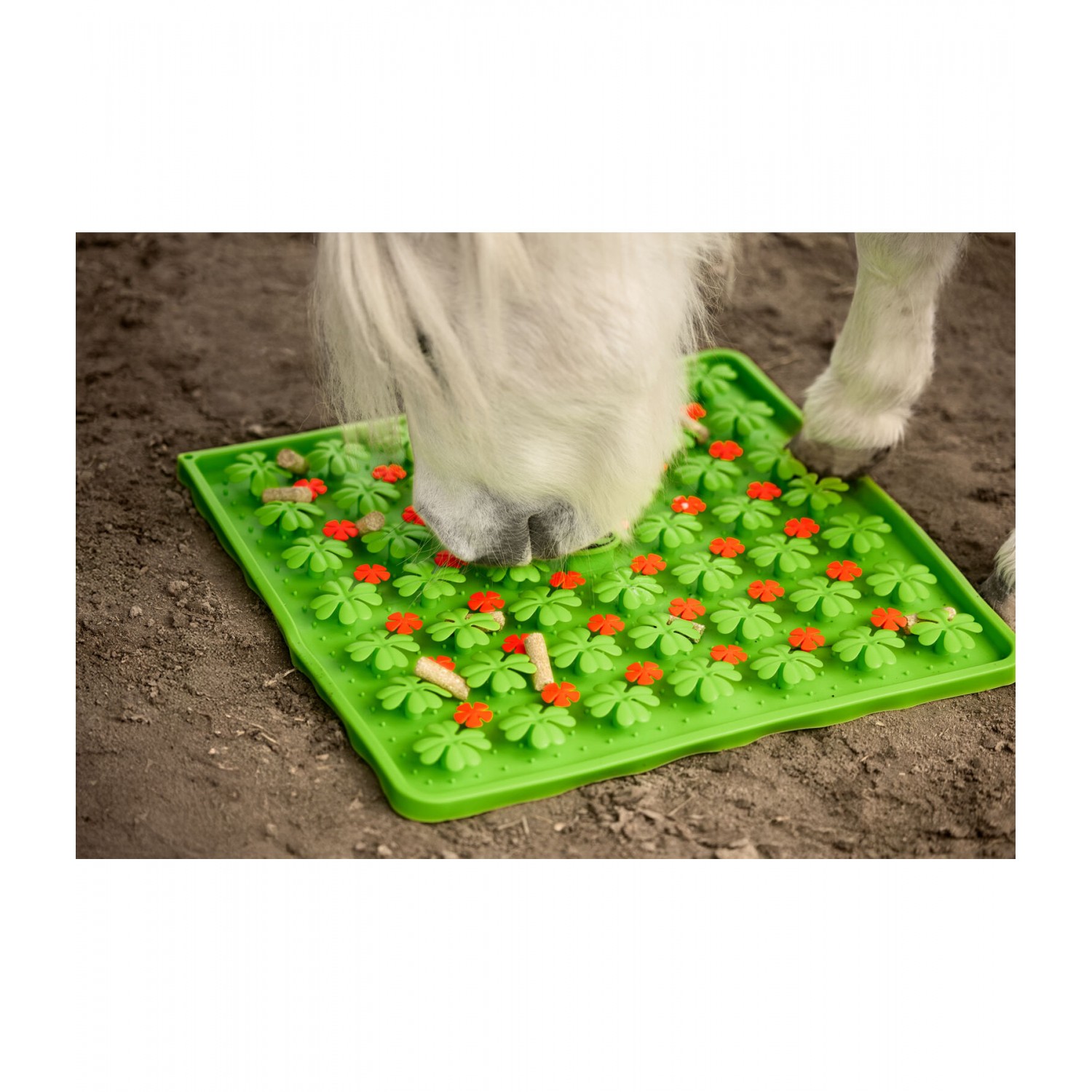 Идеально подходит для того, чтобы занять вашу лошадь и побороть скуку. Просто наполните коврик лакомствами, морковью, кусочками фруктов или пюре, чтобы стимулировать естественное обоняние вашей лошади, поскольку ей придется потрудиться, чтобы найти все лакомства на коврике. После использования просто повесьте коврик за отверстие, промойте его водой и дайте высохнуть. Изготовлен из пищевого силикона, 50 x 50 см.