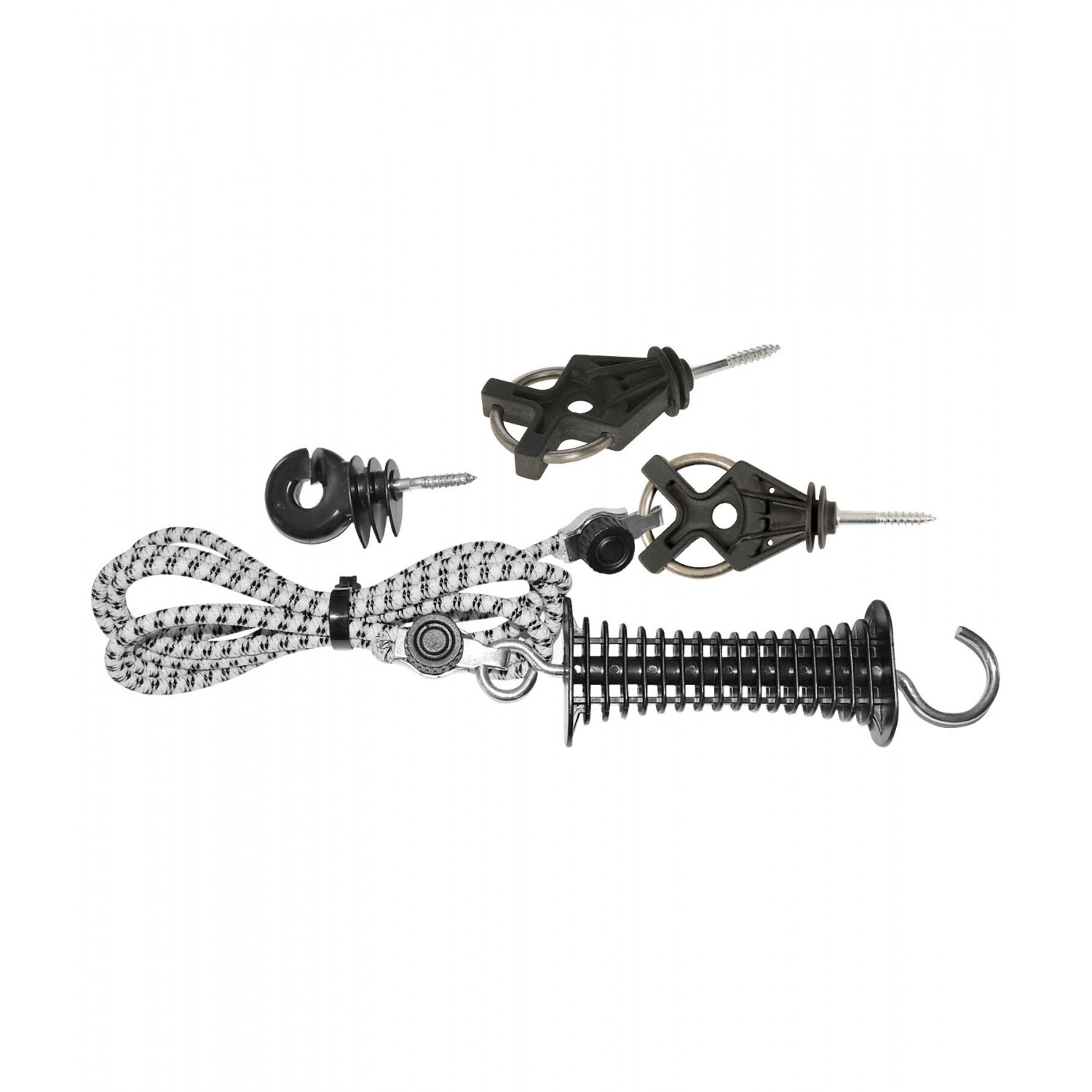 С эластичным тросом для электрического забора. Очень практичные и удобные ворота для электрического забора для проемов до 9 м. Больше никаких защемленных волос на гриве или хвосте. С крюками из нержавеющей стали. Для правильной установки системы ворот используется 3 столба. Длина может быть увеличена вдвое. В комплекте: 1 эластичный трос для электрического забора Ø 7 мм (гарантия 3 года) с соединительными крюками, 4 проводника из нержавеющей стали 0,25 мм, 1 ручка ворот, 1 кольцевой изолятор, 1 изолятор ручки ворот.