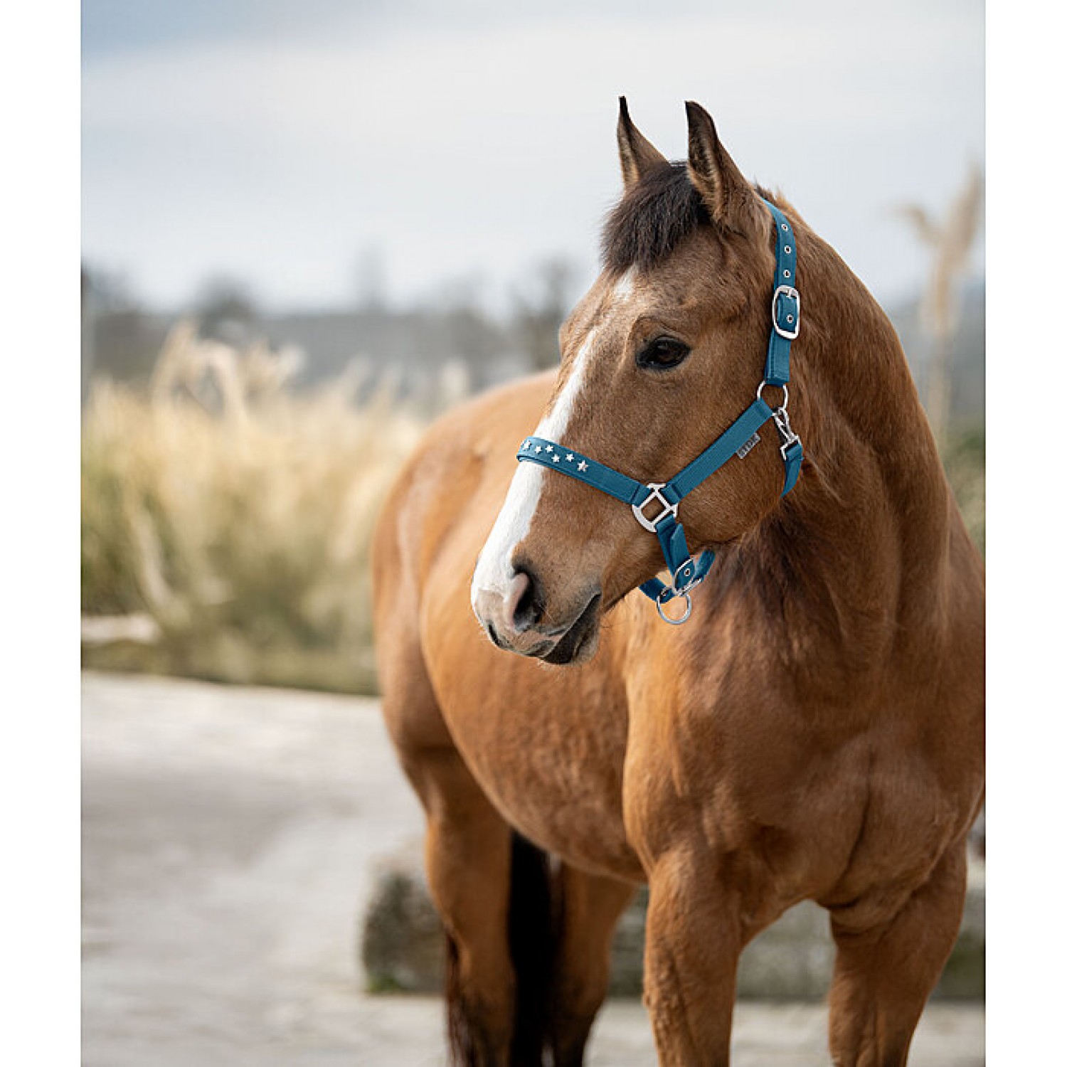 Специальный недоуздок с маленькими металлическими звездочками на капсюле. Прокладки из хлоропренового каучука на затылке и носовых ремнях. Двукратная регулировка размера.