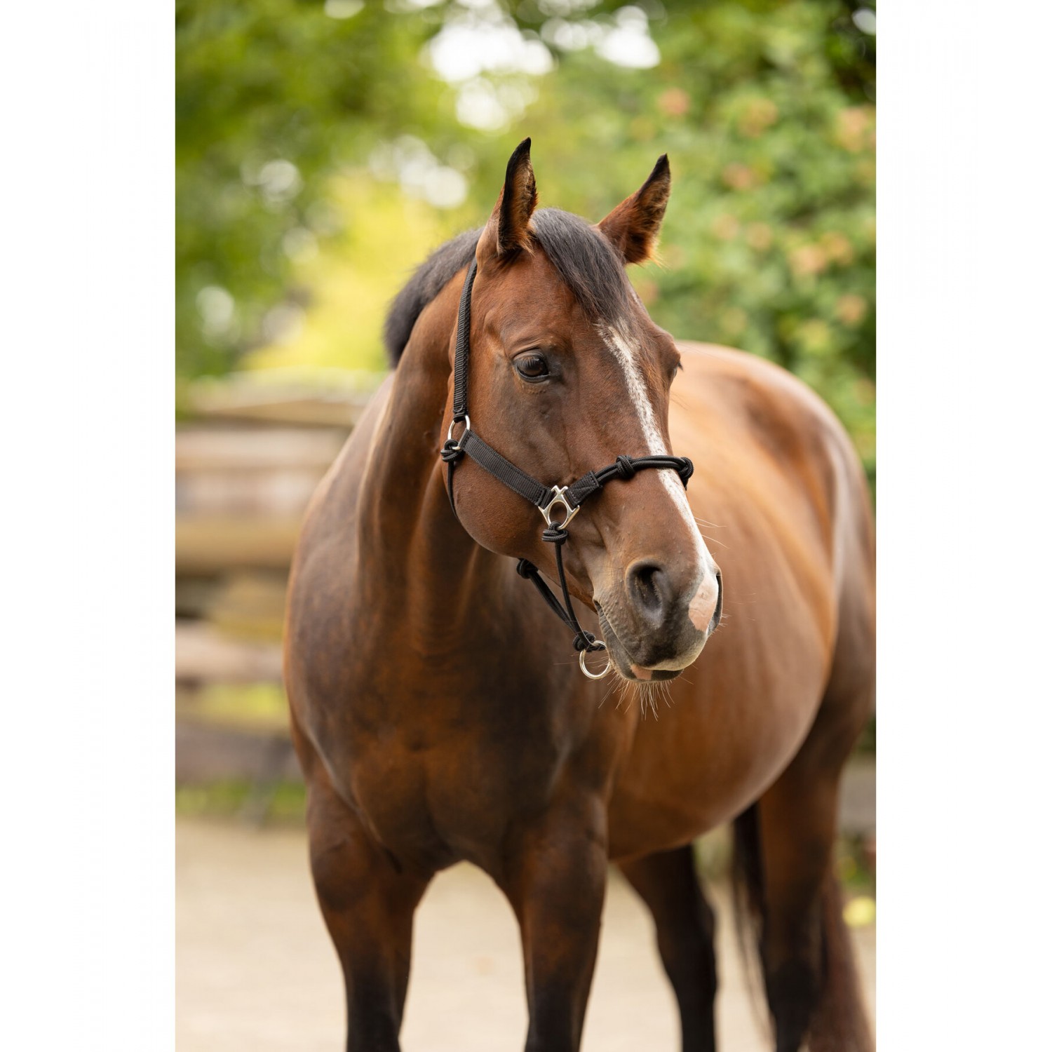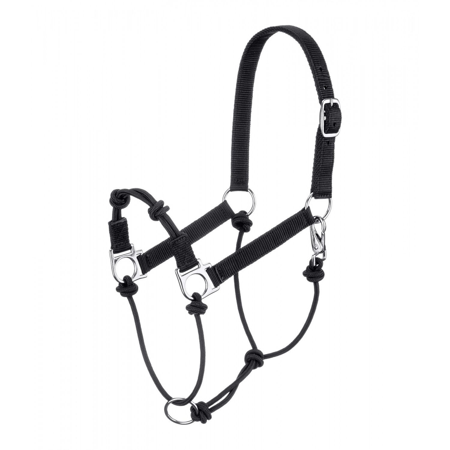 Комбинация веревочного и обычного недоуздка. Веревка, завязанная на носу, позволяет более точно взаимодействовать с лошадью во время работы. Подвижное кольцо на подбородке облегчает работу на корде. Широкий затылочный и щечные ремни предотвращают скольжение. 100% полипропилен.